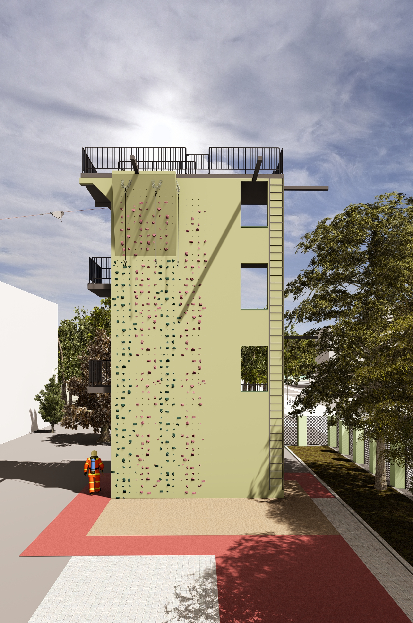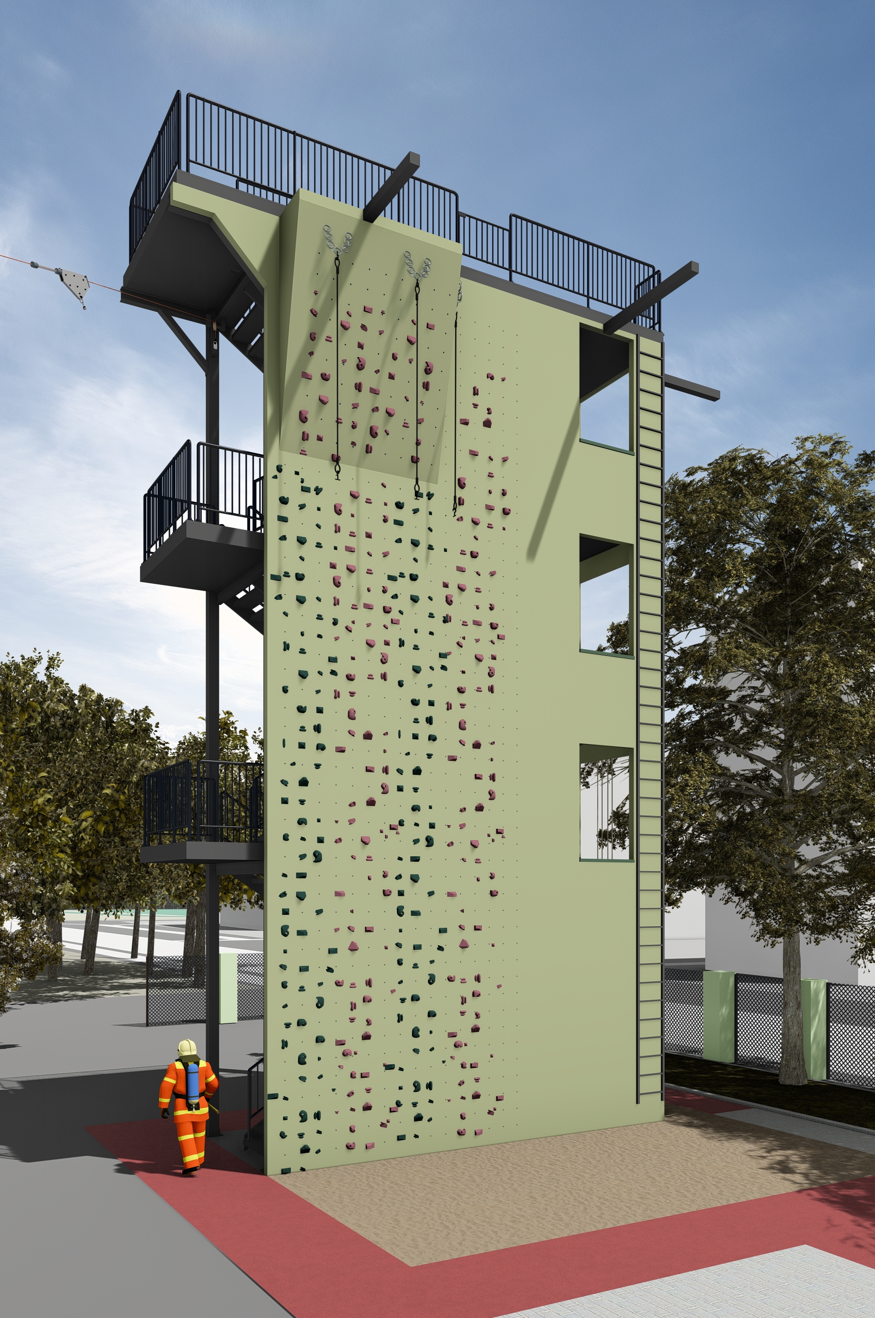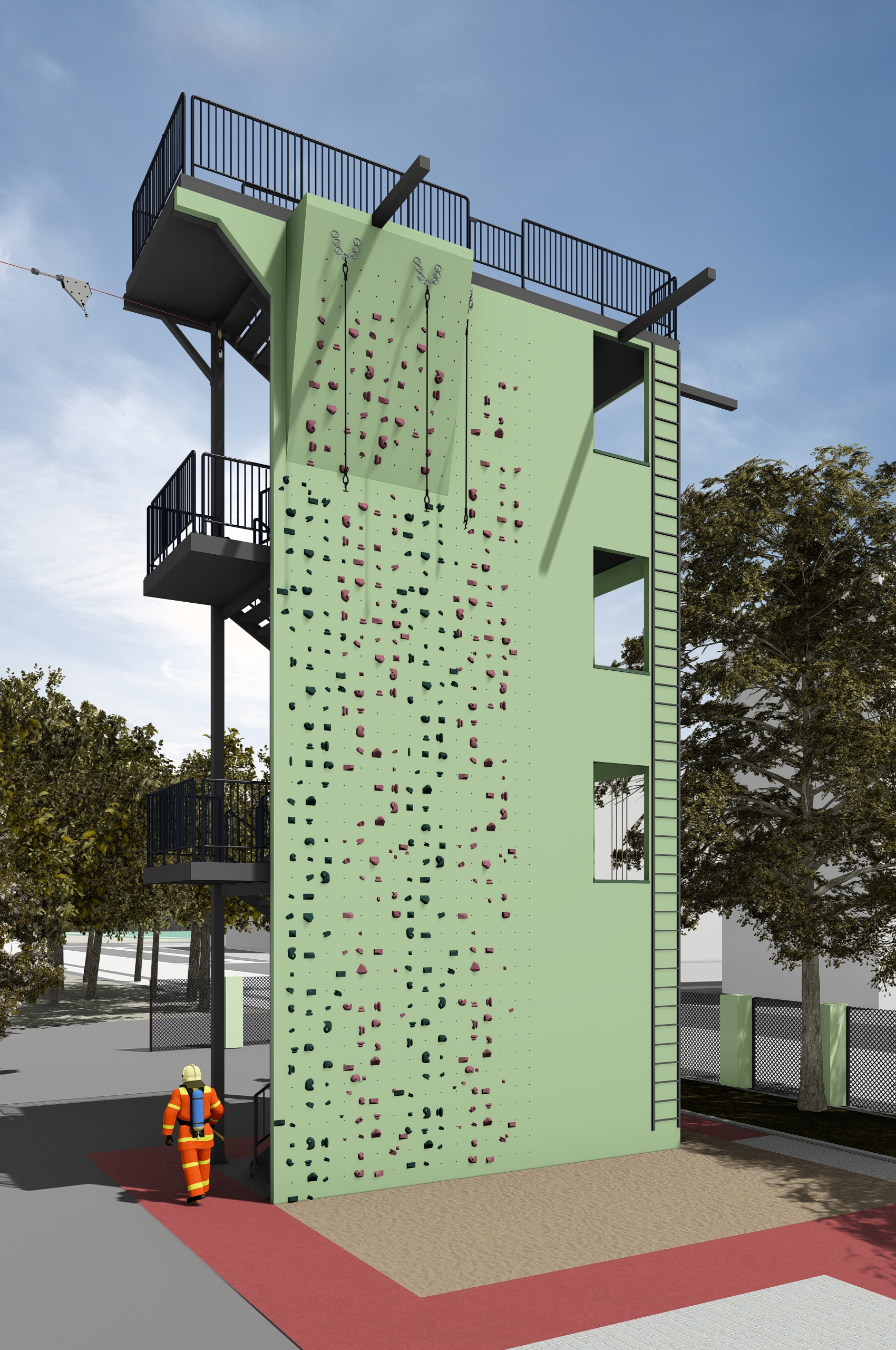 - Wspinalnię strażacką, umożliwiającą prowadzenie ćwiczeń z zakresu ewakuacji oraz działań ratowniczych na różnych poziomach wysokości,