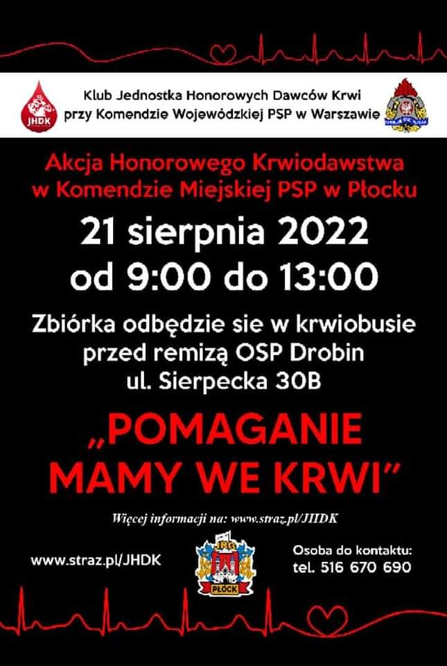 🧑🚒🩸 Serdecznie Zapraszamy 🩸🧑🚒 21.08.2022 w niedzielę o godzinie 9.00-13.00 , na Akcję Krwiodawstwa organizowaną przez #KMPSPPŁOCK klub #JednostkaHDK przy Komendzie Wojewódzkiej Państwowej Straży Pożarnej w Warszawie 🧑🚒. Zbiórka odbędzie się w Drobinie pod 🧑🚒remizą🧑🚒 #OchotniczaStrażPożarnaDrobin ,