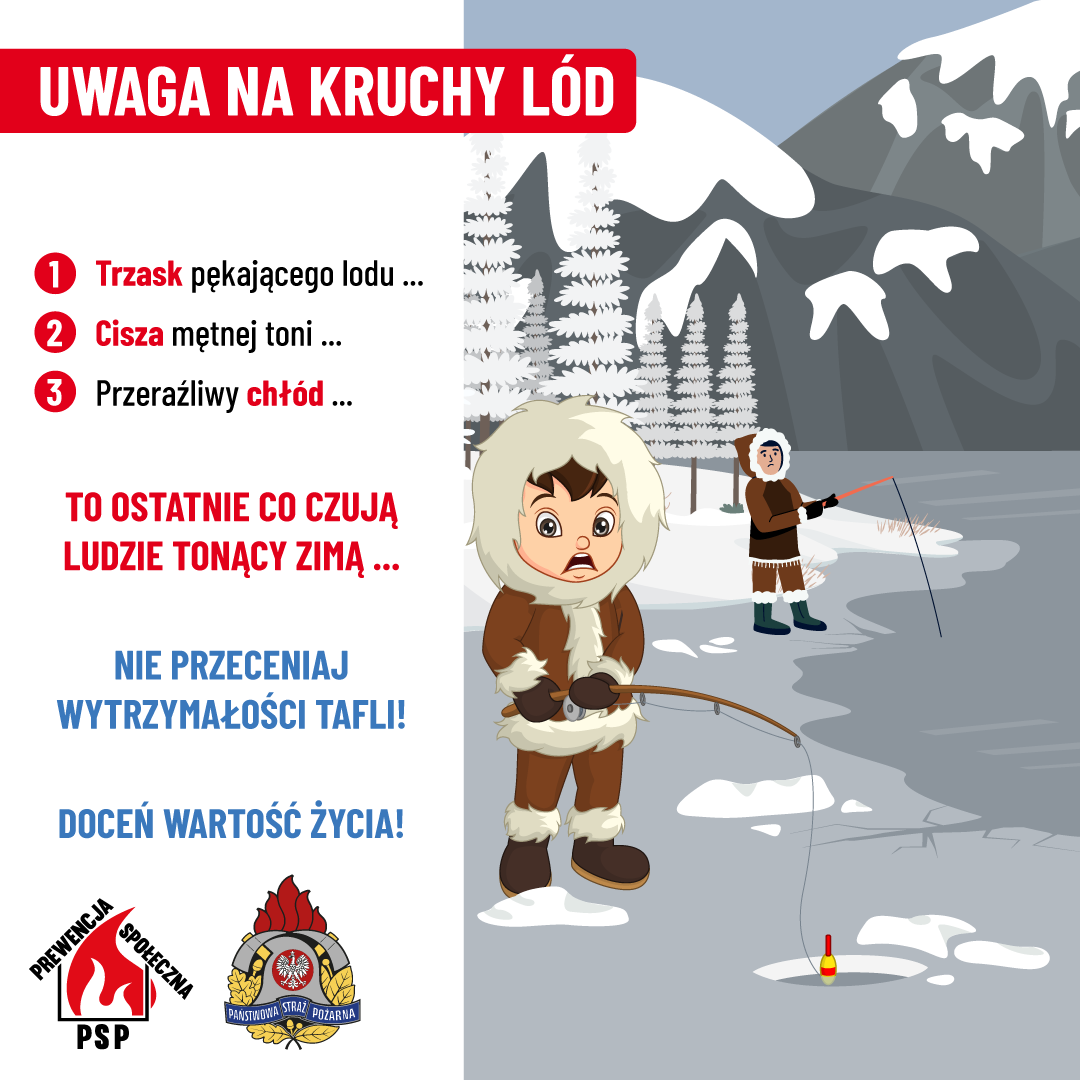 - W przypadku załamania lodu staraj się zachować spokój, jednocześnie głośno wzywając pomocy.