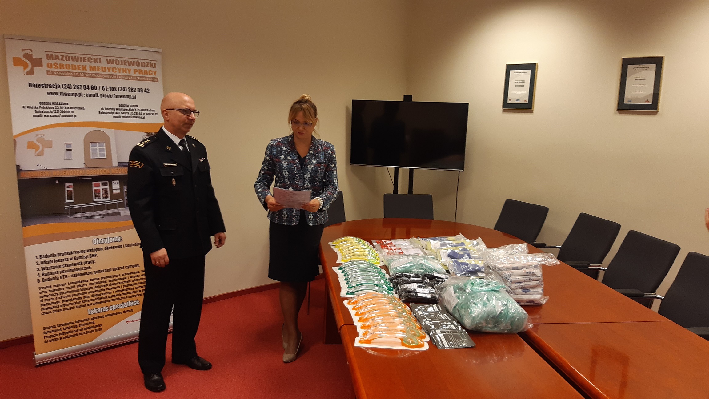 15 listopada 2022 roku w Mazowieckiem Wojewódzkim Ośrodku Medycyny Pracy z siedzibą w Płocku odbyło się przekazanie sprzętu medycznego zakupionego w ramach zadania: „Organizowanie i udzielenie pierwszej pomocy w nagłych zachorowaniach i wypadkach, które wystąpiły w miejscu pracy, służby lub pobierania nauki”. Komenda Miejska Państwowej Straży Pożarnej w Płocku reprezentowana przez Komendanta Miejskiego Państwowej Straży Pożarnej – st. bryg. Adama Dobrosielskiego otrzymała: maski krtaniowe, pasy do stabilizacji miednicy Pelvic Splint, Axiostat Rolle Gauze, opatrunki wentylowy Chest Seal Vent, Stazy taktyczne CAT, opaski elastyczne z zapinką, cewniki do podawania tlenu, maski tlenowe z workiem i drenem. Aktu przekazania sprzetu medycznego o wartości 6 659,79 zł. dokonała Pani Agnieszka Sulkowska - dyrektor WOMP w Płocku.