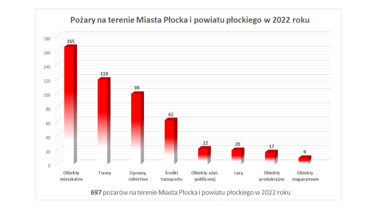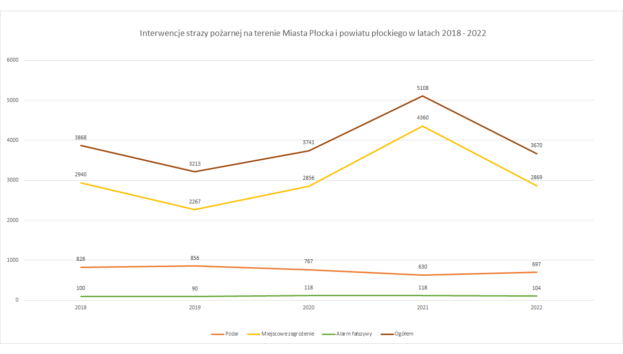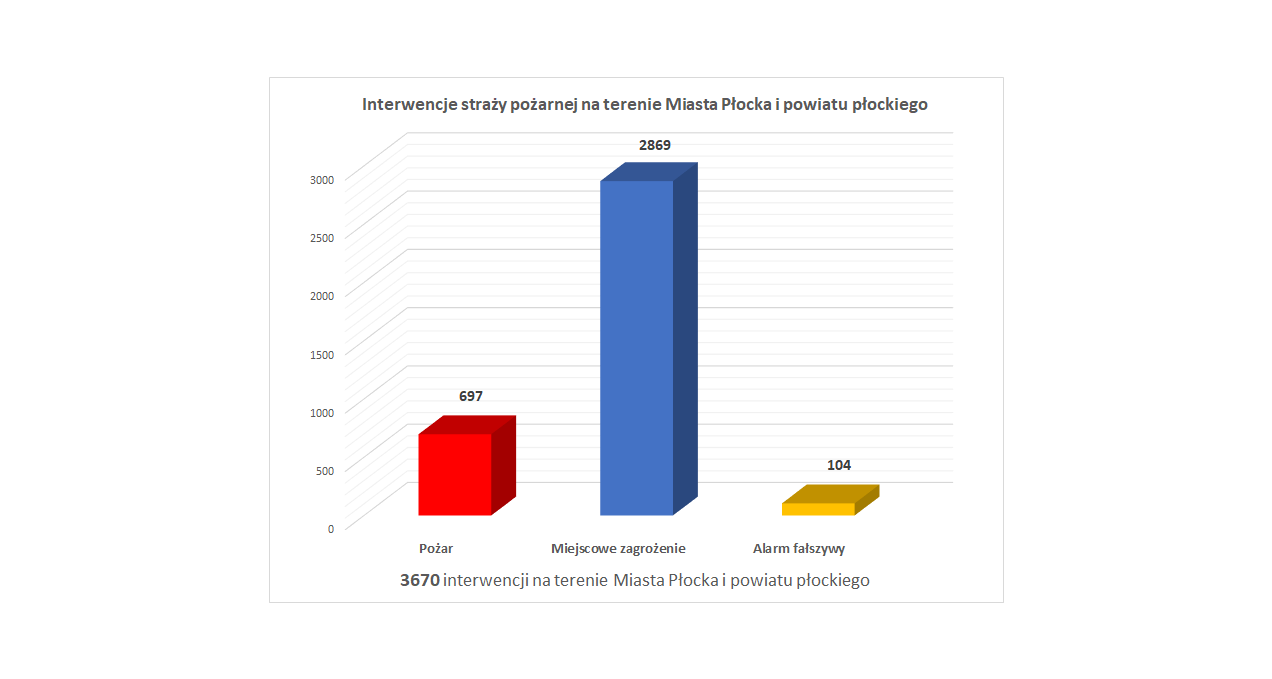 W 2022 roku strażacy z terenu powiatu płockiego i miasta Płock interweniowali łącznie 3670 razy, w tym przy 697 pożarach i 2869 miejscowych zagrożeniach. Wyjeżdżaliśmy również do 104 alarmów fałszywych. Nawiązując do roku 2021 to ilość zdarzeń zmniejszyła się o 1438.