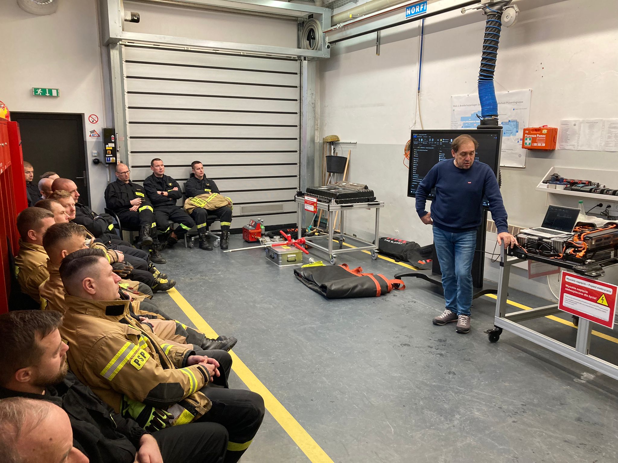 W pierwszym etapie zostały przeprowadzone zajęcia teoretyczne podczas których, przedstawiciele Firmy Volkswagen Poznań omówili budowę baterii w samochodach o napędzie elektrycznym oraz przedstawili potencjalne zagrożenia, które mogą wystąpić w wyniku mechanicznego uszkodzenia bądź awarii akumulatora. Omówiono również obowiązujące na terenie zakładu procedury oraz dokonano analizy zagrożeń podczas awarii baterii elektrycznej samochodu hybrydowego zarówno w pomieszczeniach magazynowych jak i na linii montażowej. Następnie strażacy podczas rozpoznania zakładu mieli okazję zapoznać się