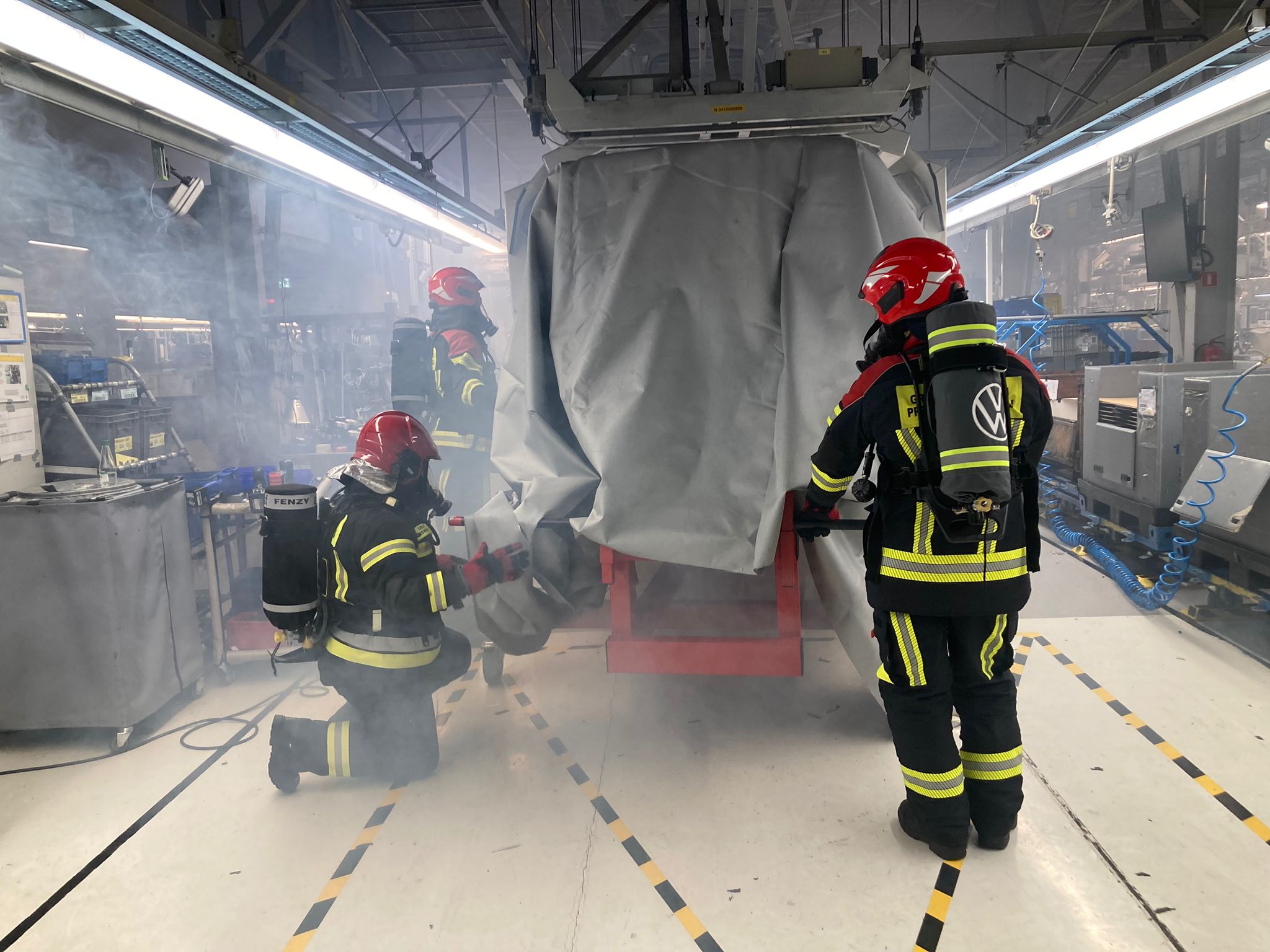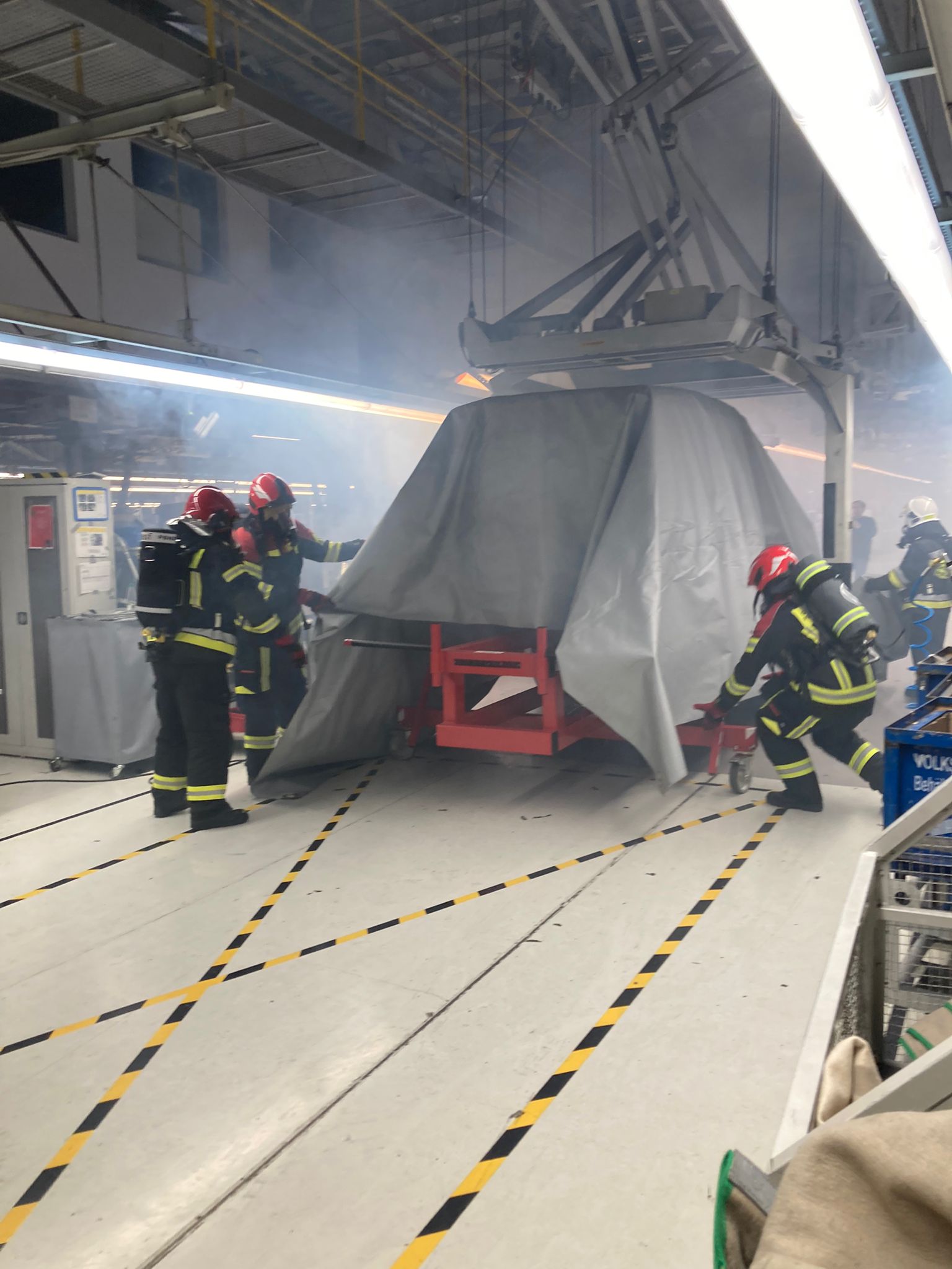 O godzinie 11:00 zasymulowano awarię baterii w samochodzie o napędzie hybrydowym na linii montażowej. W tym czasie do pracownika ochrony dotarł sygnał z systemu sygnalizacji pożarowej o zdarzeniu pożarowym. Sygnał z systemu trafia również do Stanowiska Kierowania Komendanta Miejskiego PSP w Poznaniu. W pierwszej fazie w zakładzie działania polegają na rozpoznaniu zagrożenia przez grupę prewencji VW Poznań według obowiązujących procedur. W tym czasie zaalarmowane zastępy PSP wyjeżdżają do zdarzenia. Jednocześnie odbywa się ewakuacja hali produkcyjnej wg zasad ewakuacji zakładu. Weryfikacją ewakuacji zarządza Grupa Prewencji VW Poznań. Działania grupy prewencji w pierwszej fazie po rozpoznaniu i zakończeniu ewakuacji polegają na próbie usunięcia pojazdu z linii montażowej oraz zakryciu specjalnym kocem gaśniczym w sposób taki, żeby nie dopuścić do rozprzestrzeniania się pożaru. Po przyjeździe na miejsce zdarzenia zastępów PSP kierowanie działaniami przejmuje dowódca przybyły na miejsce pożaru w pierwszym rzucie. W czasie ćwiczeń zasymulowano