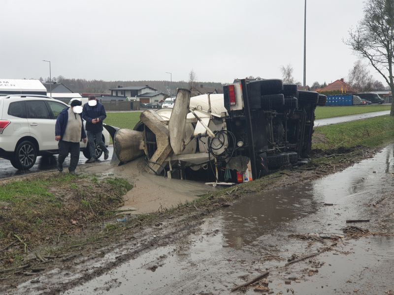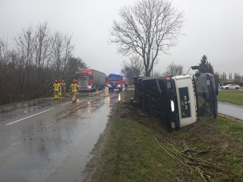 Po przybyciu na miejsce zdarzenia strażacy zastali samochód ciężarowy przewożący beton, który chcąc ominąć spadające drzewo, wykonał nagły manewr w wyniku którego przewrócił się do przydrożnego rowu. Kierujący pojazdem opuścił pojazd przed przybyciem służb.