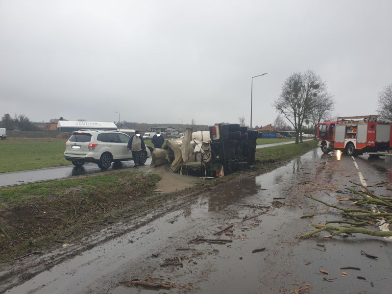 Kierujący pojazdem nie wymagał pomocy Pogotowia. Warunki na drodze były bardzo trudne w związku z silnym wiatrem i padającym deszczem.