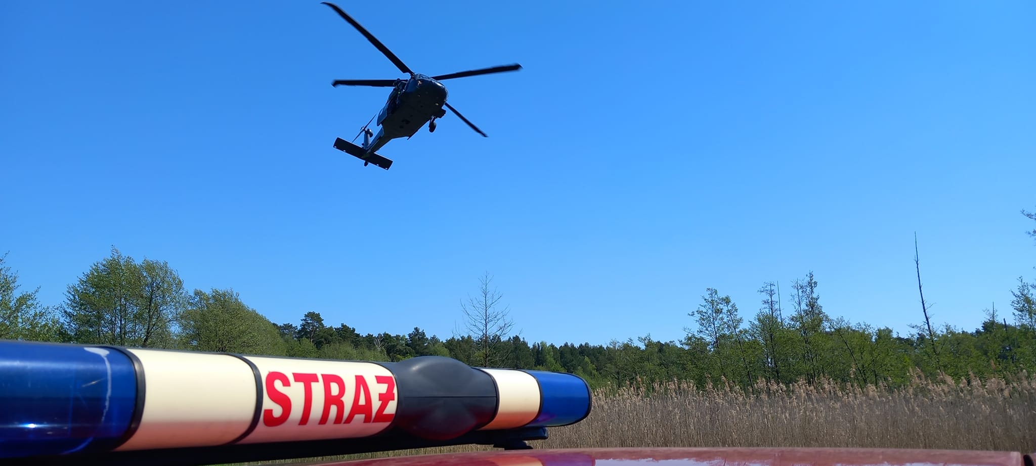 ćwiczenie z gaszenia pożaru lasu przy wykorzystaniu policyjnego śmigłowca