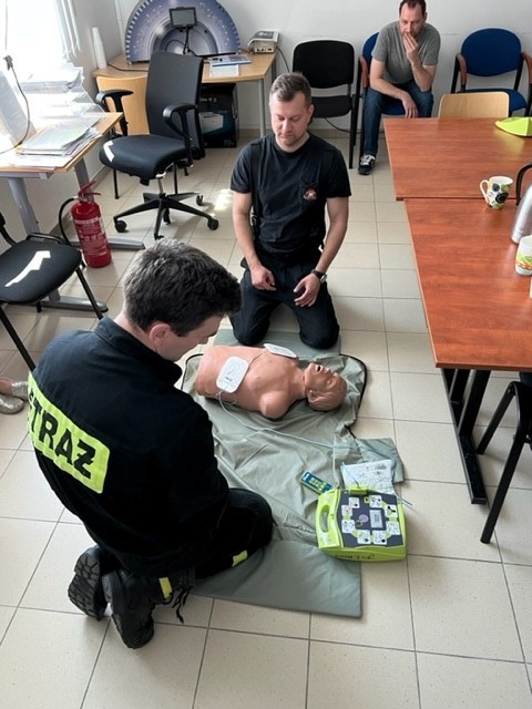 Drugim punktem omówionym i przećwiczonym wraz ze strażakami były zagadnienia z zakresu pierwszej pomocy. Pracownicy przećwiczyli zasady udzielania pierwszej pomocy poszkodowanym do momentu przybycia na miejsce Pogotowia Ratunkowego. Ćwiczenia obejmowały również przypadek prowadzenia resuscytacji krążeniowo oddechowej z wykorzystaniem AED.