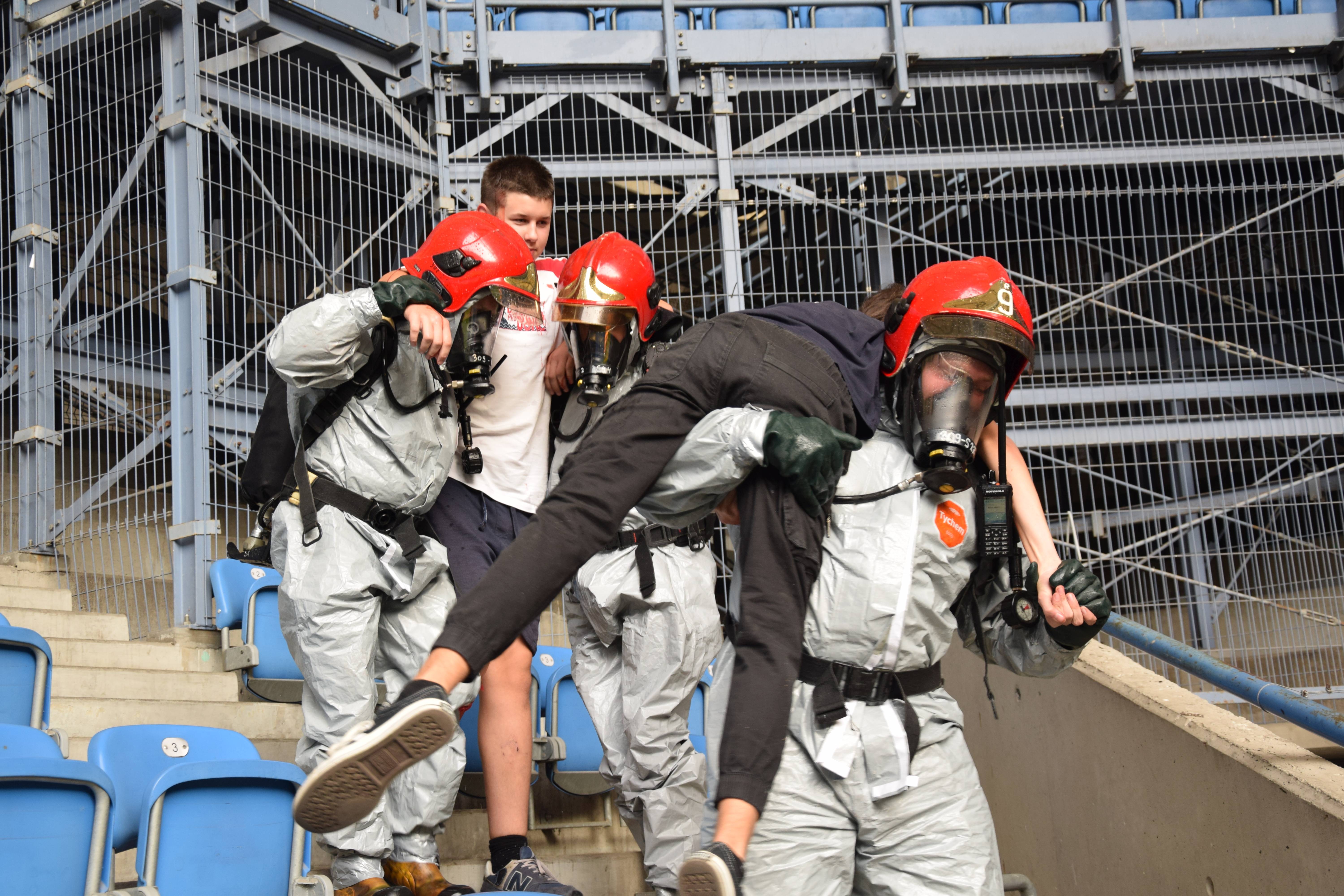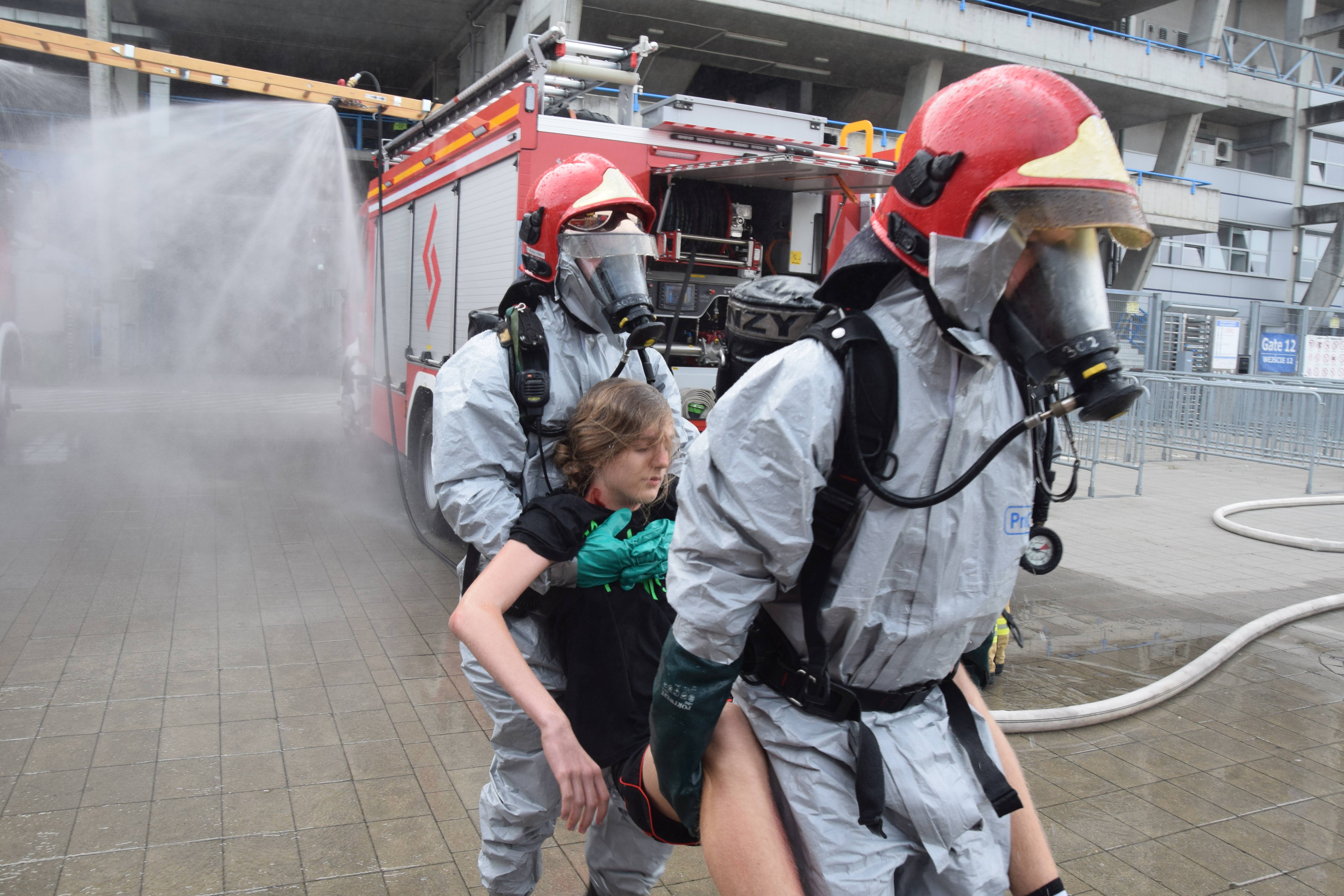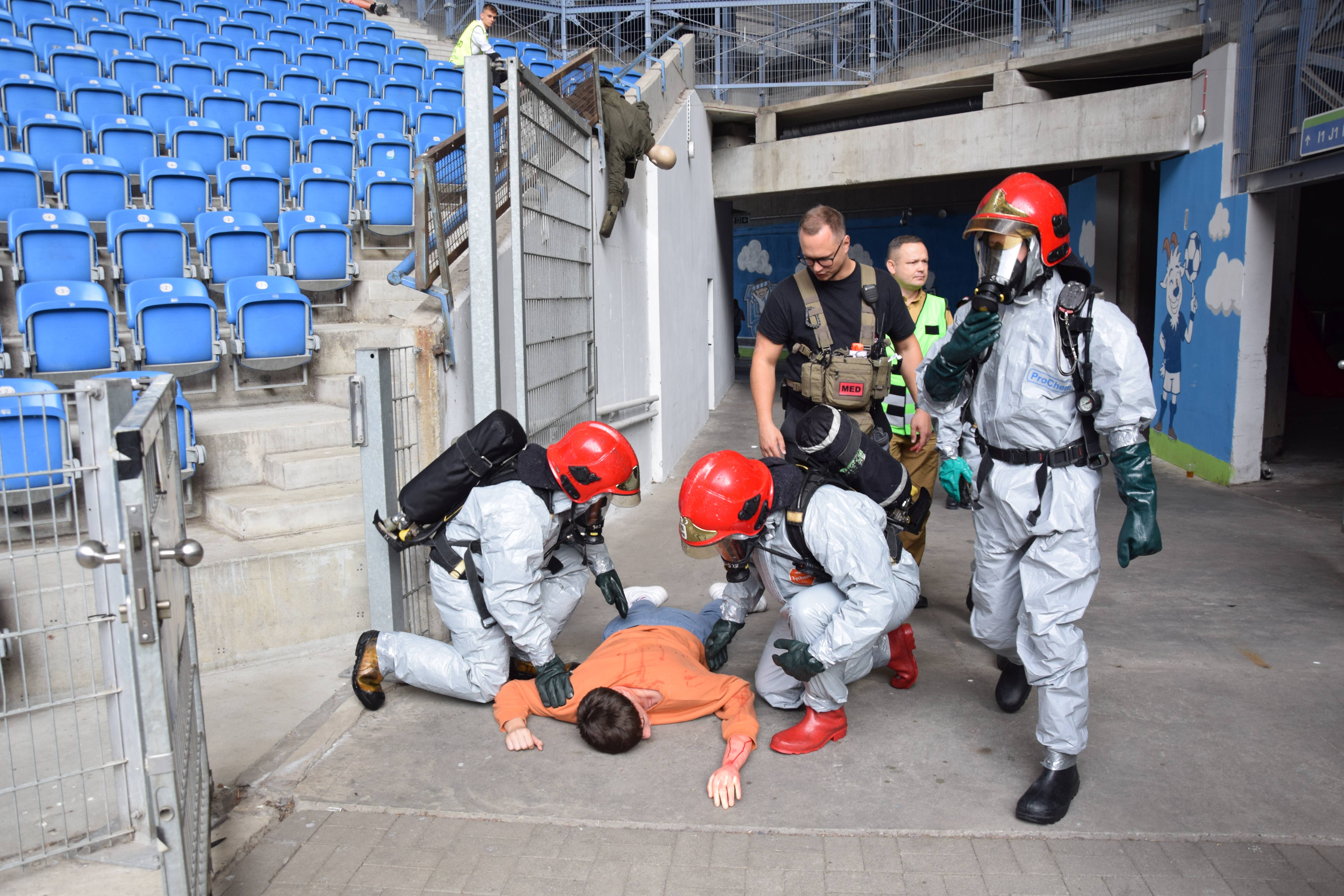 Po konferencji przystąpiono do realizacji pierwszego założenia, które dotyczyło wykorzystanie bezzałogowych statków powietrznych – dronów w atakach na arenie sportowej. W tym celu podczas ćwiczeń doszło do ataku na kibiców znajdujących się na trybunach stadionu, poprzez rozpylenie czynnika chemicznego z drona przelatującego nad stadionem. Zadysponowane siły i środki dokonały rozpoznania, przeprowadziły ewakuację oraz dekontaminację wstępną. Na miejscu zdarzenia wyznaczono strefy działań i dokonano segregacji poszkodowanych przy współudziale z Zespołem Ratownictwa Medycznego. Powyższe działania zabezpieczali funkcjonariusze Policji.