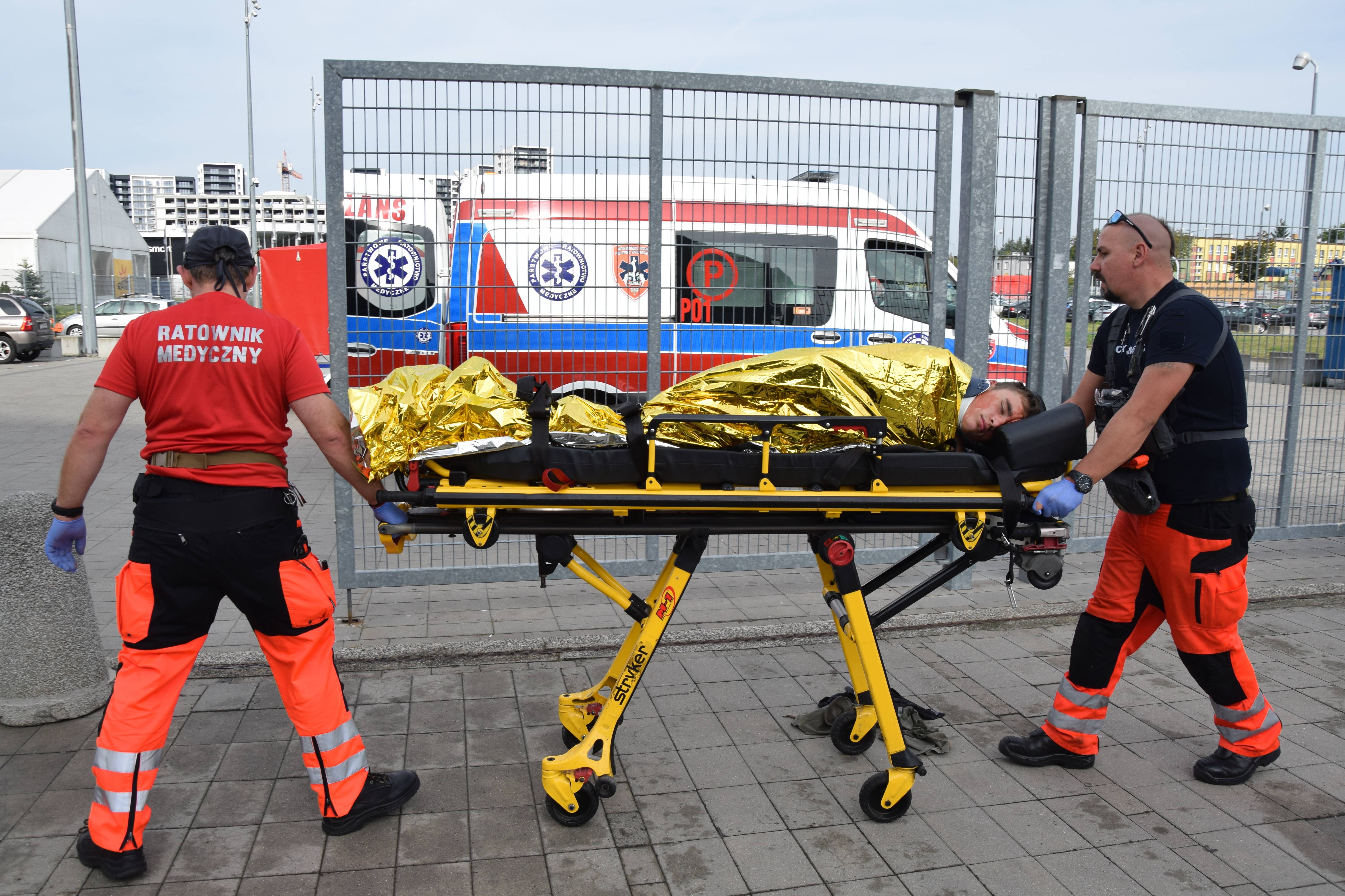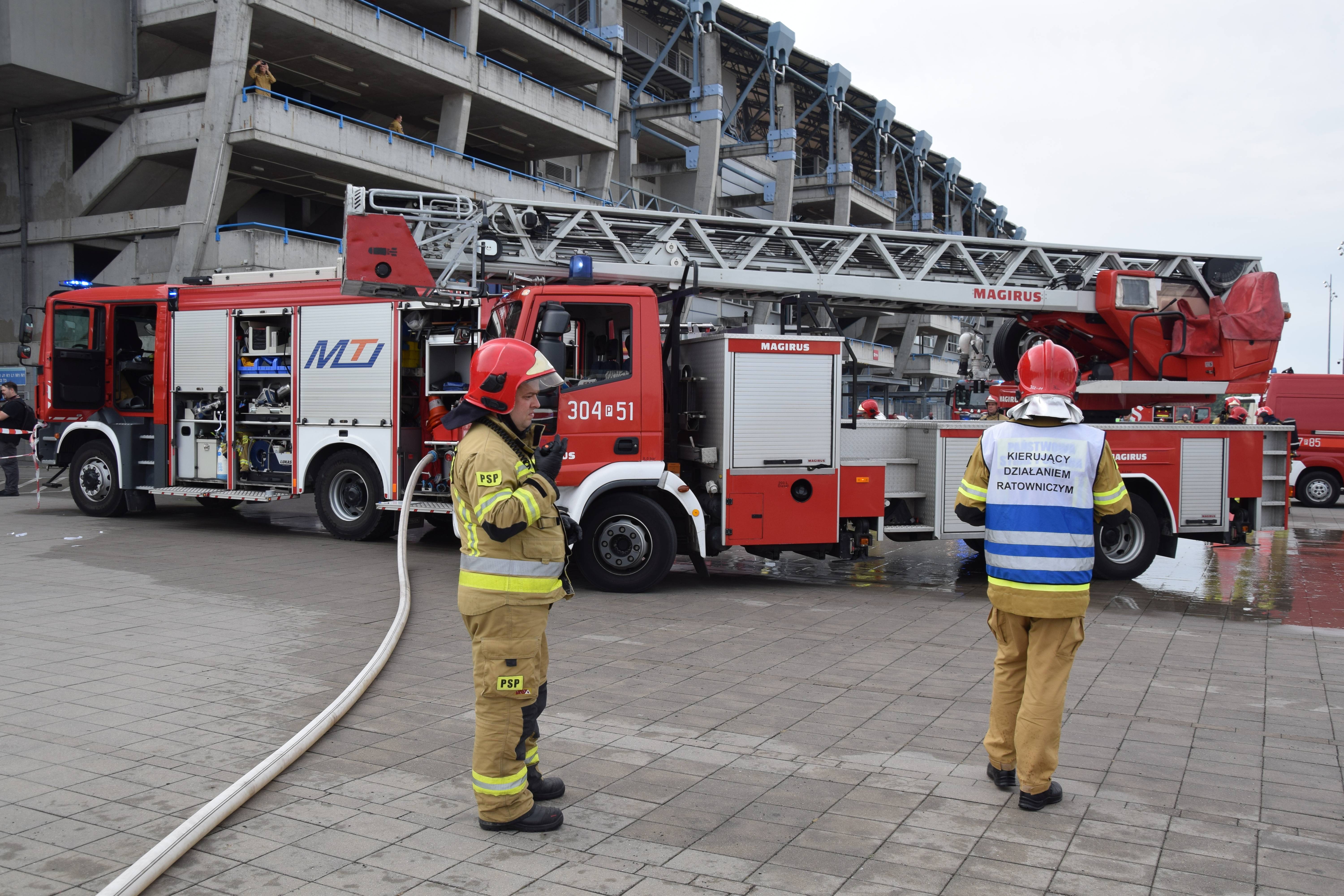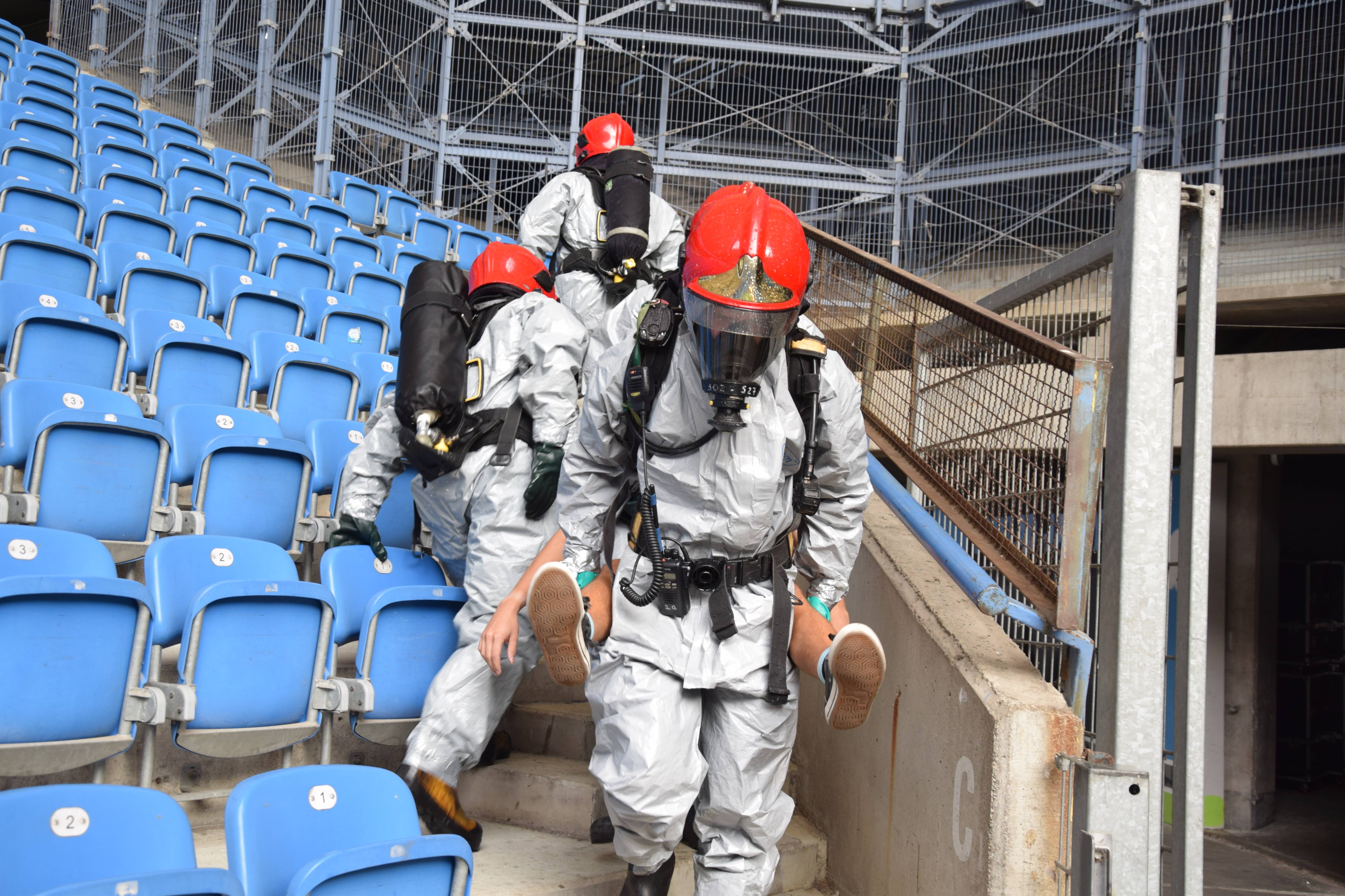 Po konferencji przystąpiono do realizacji pierwszego założenia, które dotyczyło wykorzystanie bezzałogowych statków powietrznych – dronów w atakach na arenie sportowej. W tym celu podczas ćwiczeń doszło do ataku na kibiców znajdujących się na trybunach stadionu, poprzez rozpylenie czynnika chemicznego z drona przelatującego nad stadionem. Zadysponowane siły i środki dokonały rozpoznania, przeprowadziły ewakuację oraz dekontaminację wstępną. Na miejscu zdarzenia wyznaczono strefy działań i dokonano segregacji poszkodowanych przy współudziale z Zespołem Ratownictwa Medycznego. Powyższe działania zabezpieczali funkcjonariusze Policji.