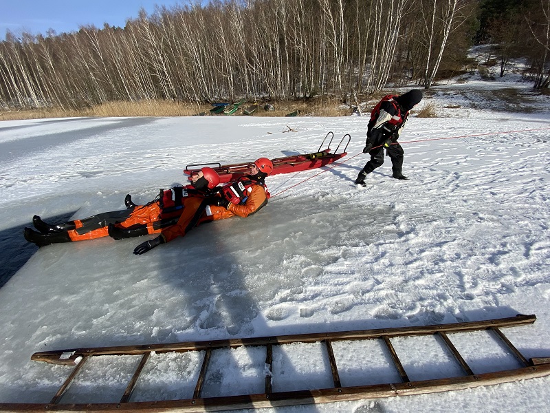 W lutym i marcu na zamarzniętym jeziorze w Kamińsku odbyły się ćwiczenia z zakresu ratownictwa lodowego, których celem było doskonalenie zasad pracy w ubraniach wypornościowych, techniki ewakuacji poszkodowanego z przerębla, umiejętności posługiwania się sprzętem do ratownictwa wodnego i lodowego oraz umiejętności ewakuowania osoby poszkodowanej poza lód.