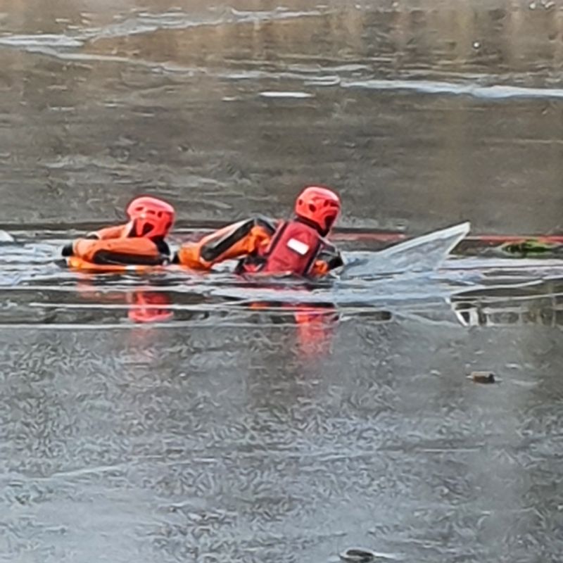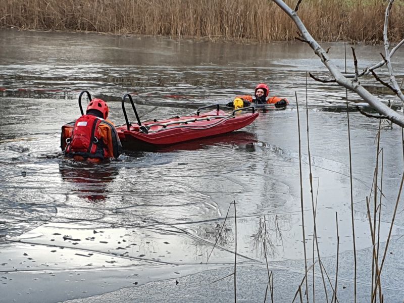 18 stycznia 2022 roku, strażacy z JRG5 doskonalili techniki ratownictwa wodno-lodowego na akwenach w rejonie operacyjnym.