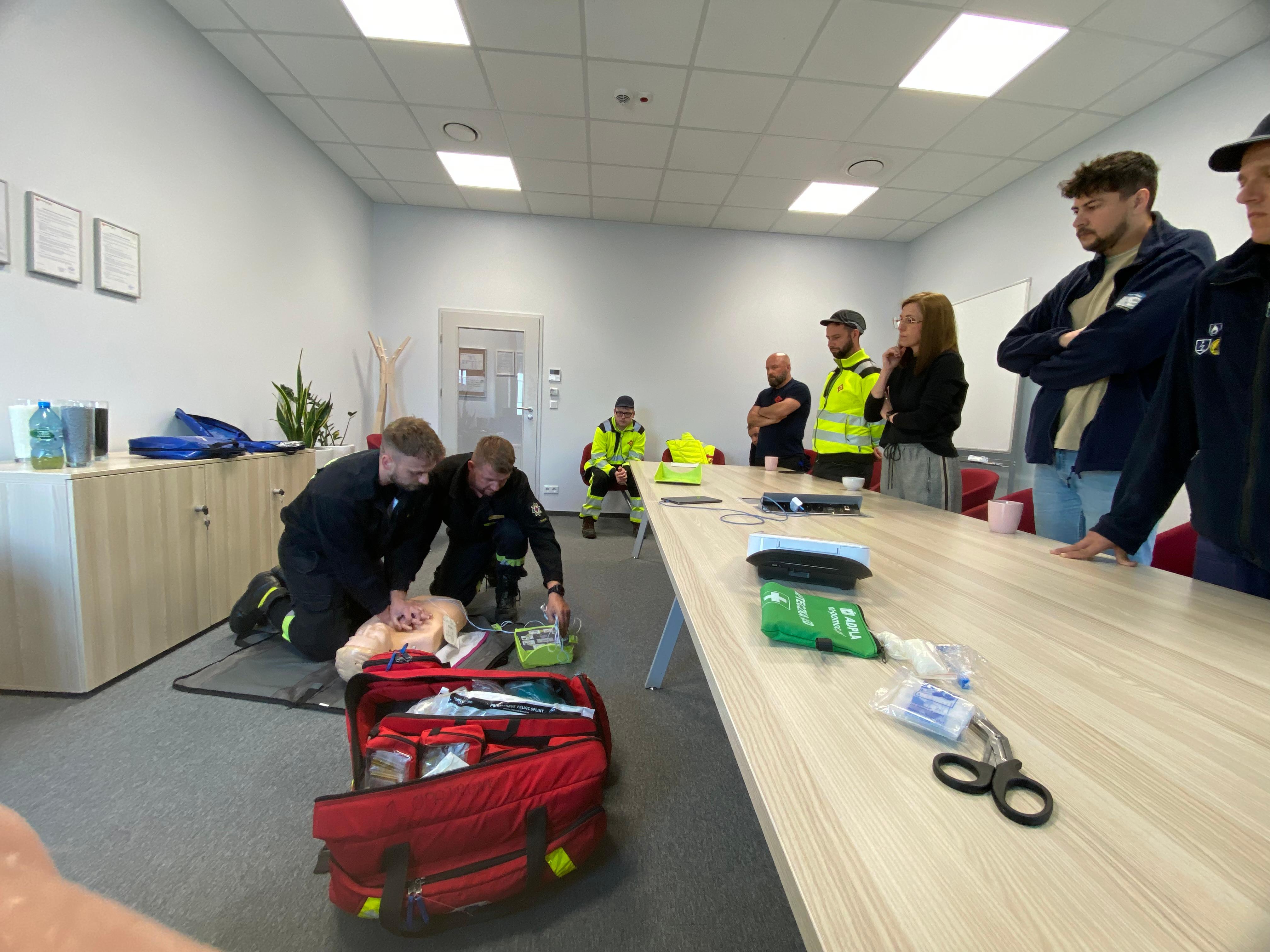 Strażacy po przeprowadzeniu ewakuacji przystąpili do dalszych elementów szkolenia. Podczas ćwiczeń pracownicy mogli m. in: zapoznać się z wyposażeniem samochodu ratowniczo-gaśniczego, na własnej skórze sprawdzić wyposażenie i ubiór w jaki strażak musi być przygotowany wchodząc do pożaru, dowiedzieć się jakich gabarytów są narzędzia do ratownictwa technicznego, popracować w strefie zadymienia używając kamery termowizyjnej oraz ugasić pożar cieczy palnej za pomocą gaśnicy. Podczas szkolenia omówiono również podstawy ratownictwa medycznego gdzie tematem przewodnim było nagłe zatrzymanie krążenia oraz działania jakie trzeba podjąć w celu pomocy osobie poszkodowanej.