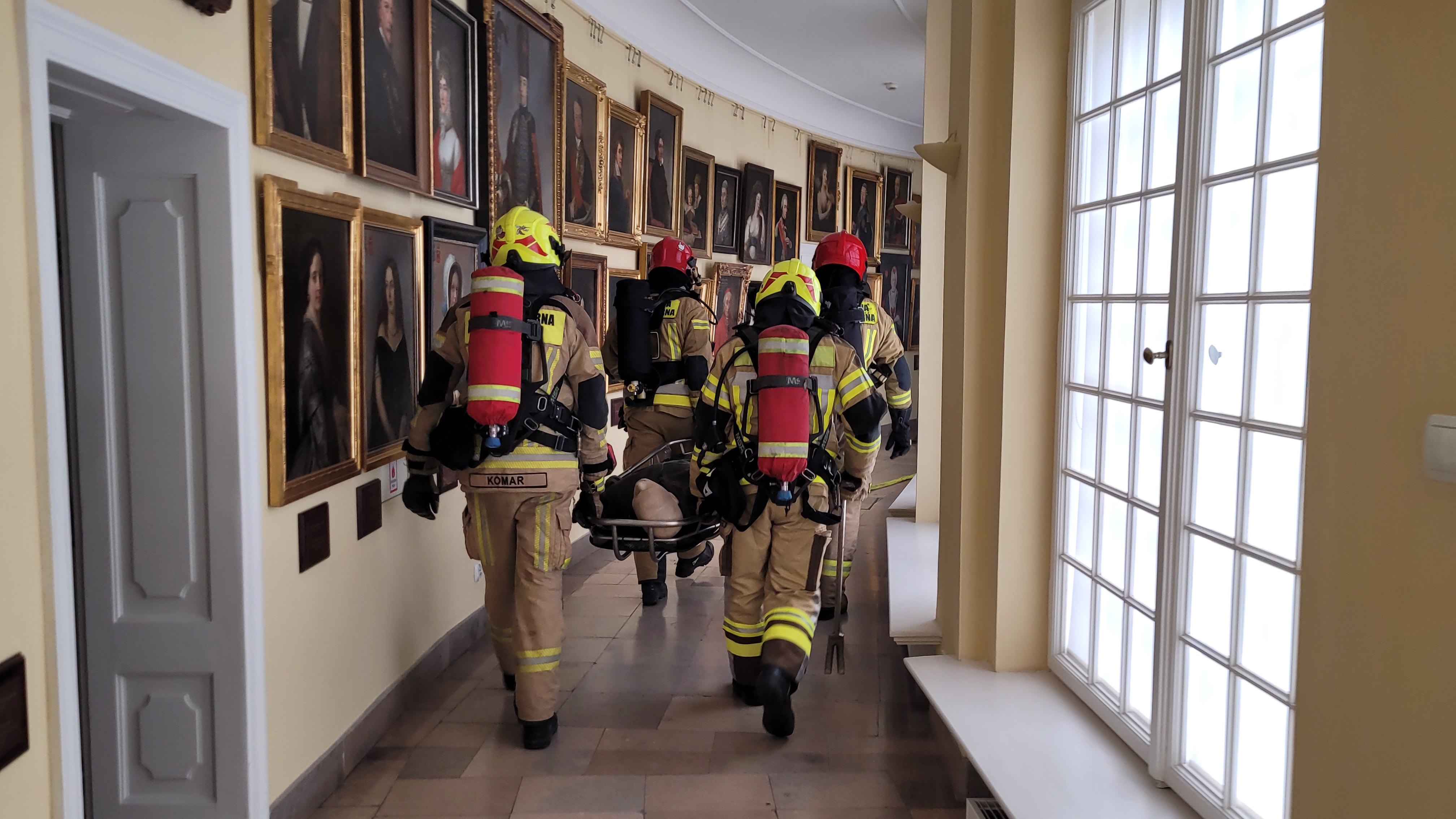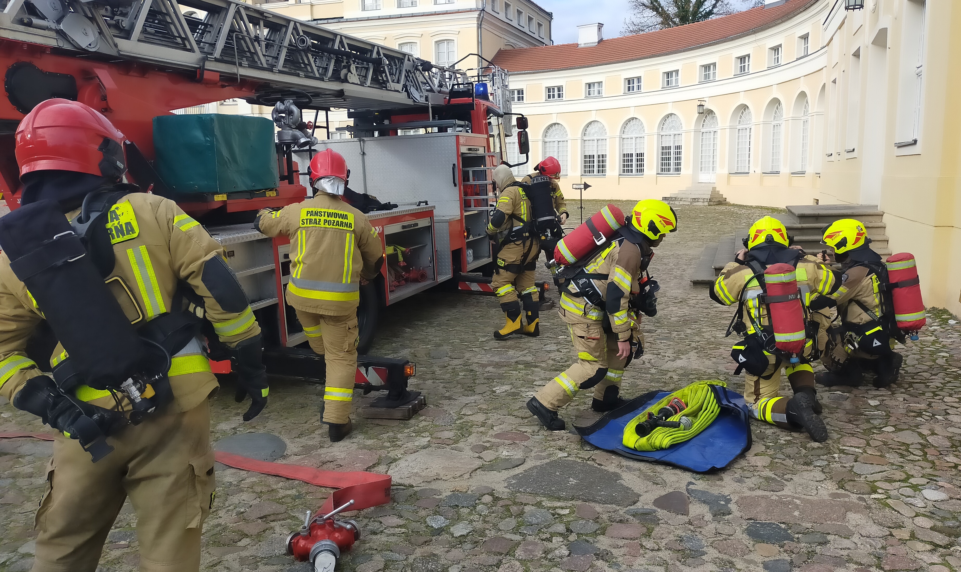 Dnia 6 listopada 2023 roku o godz. 10.00 Stanowisko Kierowania Komendanta Miejskiego w Poznaniu przyjęło zgłoszenie o pożarze w Pałacu w Rogalinie - Odział Muzeum Narodowego. Na miejsce zdarzenia zadysponowano w pierwszej kolejności dziewięć zastępów Państwowej i Ochotniczych Straży Pożarnej. Tak rozpoczęły się ćwiczenia taktyczno-bojowe Jednostki Ratowniczo-Gaśniczej nr 9 na powyższym obiekcie znajdującym się w rejonie operacyjnym jednostki. Jeszcze przed przyjazdem służb ratowniczych Dyrektor Muzeum zarządził ewakuację osób oraz części zbiorów muzealnych z zagrożonego obiektu. Ćwiczenia zostały podzielone na dwa panele: praktyczny i teoretyczny. Celem ćwiczeń było praktyczne sprawdzenie warunków ewakuacji, doskonalenie współpracy na linii PSP i Dyrekcja Muzeum oraz współpraca z pracownikami muzeum. Podczas ćwiczeń sprawdzono także praktyczne możliwości ewakuacji i prowadzenia działań gaśniczych przy wykorzystaniu SCD 30 oraz SCH 29. Przy okazji ćwiczeń doskonalono również umiejętność organizacji łączności na poziomie dowodzenia taktycznego z podziałem na odcinki bojowe. W części teoretycznej ćwiczeń strażacy mogli wysłuchać prelekcji przedstawionej przez pracownika Muzeum, Pana Krzysztofa Kalitko na temat: „Ewakuacja obiektów w sytuacji zagrożenia”. Podczas wykładu poruszone zostały zagadnienia w zakresie realizacji sprawnej ewakuacji zbiorów znajdujących się w Muzeum Narodowym w Rogalinie. Na zakończenie dokonano podsumowania ćwiczeń wraz ze spostrzeżeniami i wnioskami do realizacji w celu usprawnienia prowadzonych działań zarówno przez jednostki ochrony przeciwpożarowej jak i pracowników Muzeum.