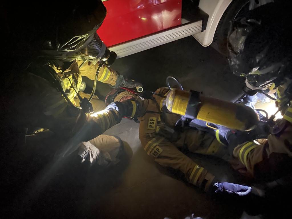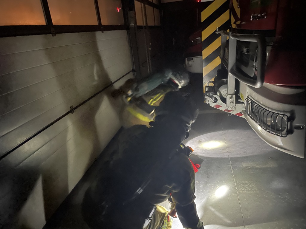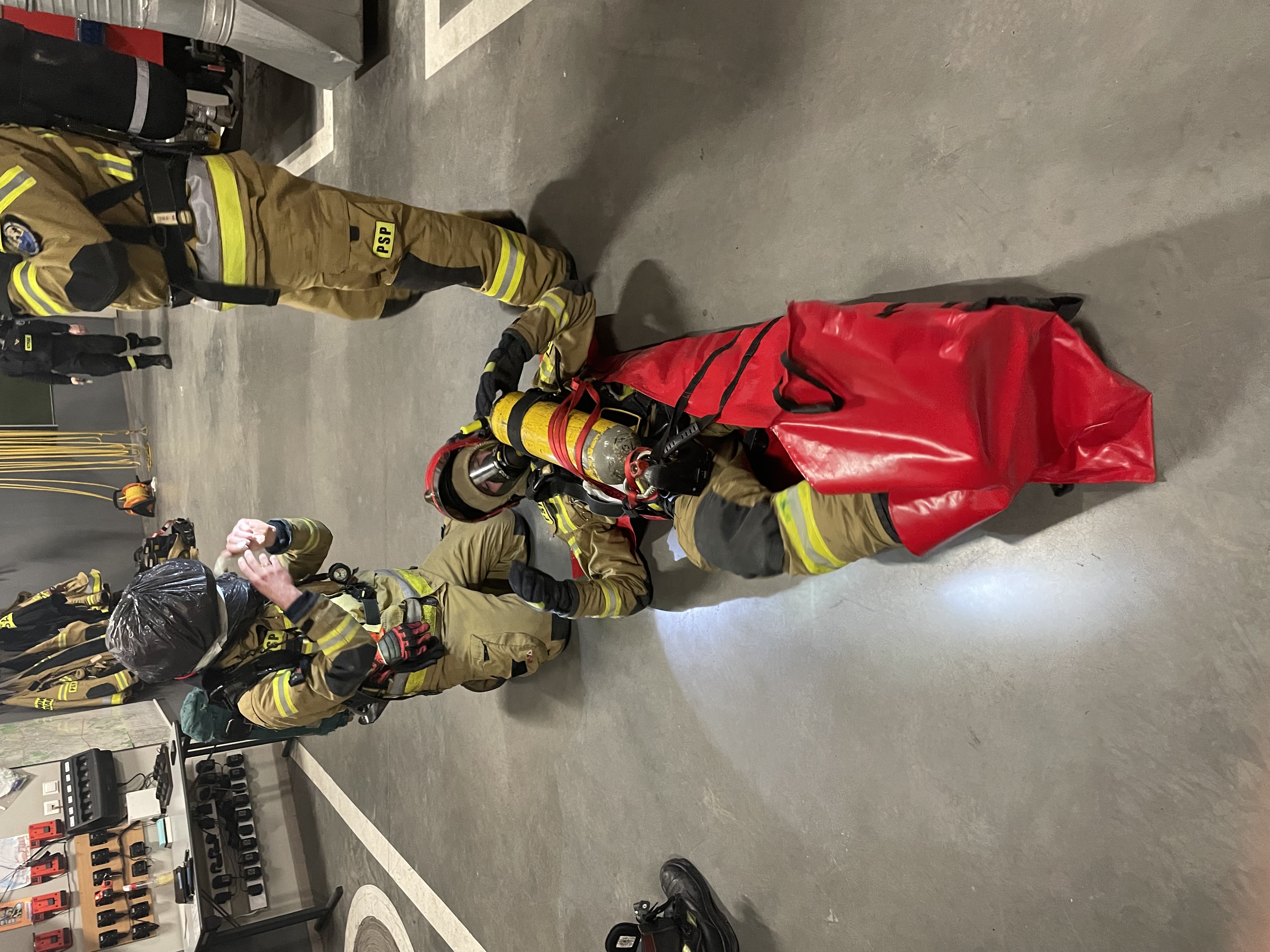 W myśl powyższej maksymy funkcjonariusze systemu zmianowego JRG-1 zrealizowali ćwiczenia praktyczne z zakresu ewakuacji nieprzytomnego strażaka ze strefy zagrożenia. RIT (rapid intervention team) to w wolnym tłumaczeniu zespół szybkiej interwencji, którego zadaniem jest rozpoznanie, stała gotowość oraz zapewnienie na miejscu akcji natychmiastowej pomocy poszkodowanym ratownikom przebywającym w strefie niebezpiecznej. Scenariusz ćwiczeń zakładał sytuację w której jeden ze strażaków ulega wypadkowi, traci przytomność, a jego sprzęt ochrony układu oddechowego uszkodził się. Rota RIT wyposażona w specjalnie przygotowany zestaw ewakuacyjny funkcjonujący na JRG 1, nasłuchując włączonego sygnalizatora bezruchu odnajduje poszkodowanego strażaka oraz dokonuje zmiany źródła powietrza wraz z wymianą maski. Następnie przy użyciu noszy płachtowych rota RIT ewakuuje poszkodowanego strażaka ze strefy niebezpiecznej. Ratownicy wykonujący powyższe zadanie pracują w zasłoniętych maskach oraz przy wyłącznym świetle (realna widoczność równa zeru ). Podczas treningu prowadzone jest monitorowanie czasu pracy ratowników przebywających w strefie oraz utrzymana stała łączność radiowa.