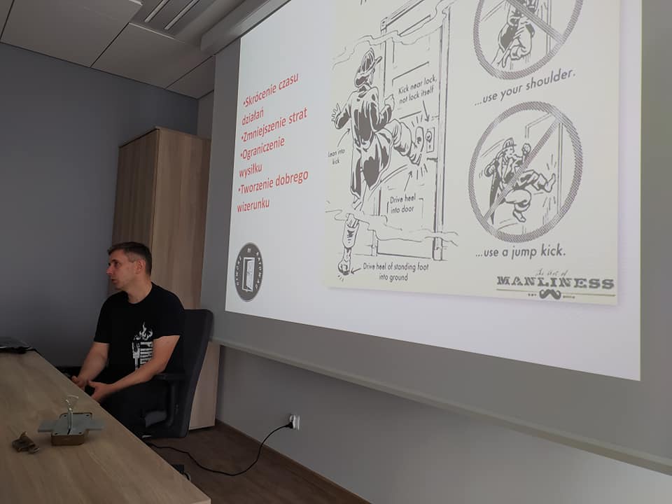 Dzięki uprzejmości aspiranta Adama Skrzypkowskiego prowadzącego profil "Otwórz by ratować" strażacy JRG 4 mieli okazję zapoznać się i przećwiczyć różne techniki siłowego pokonywania przeszkód. Główną przeszkodę stanowiły drzwi - symulator do ćwiczeń wykonany przez naszego gościa. Okazało się, że jest wiele niuansów użycia urządzenia wielofunkcyjnego Halligan bar jak i sporo metod "przyłożenia siły".