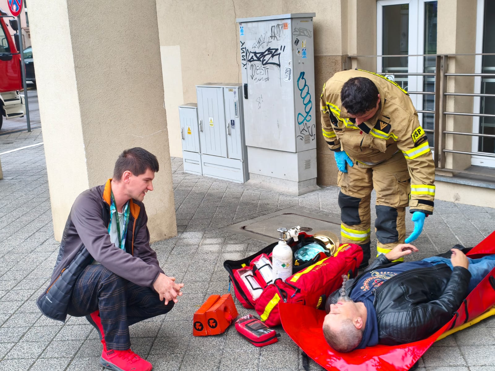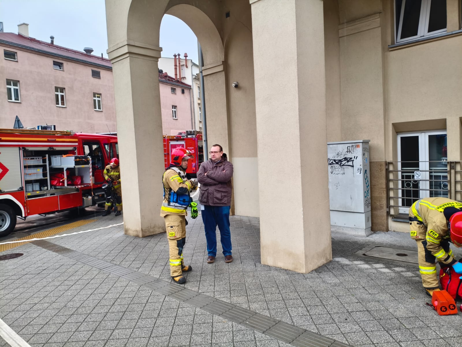 Ćwiczenia rozpoczęły się od uruchomienia próbnego alarmu pożarowego, który miał na celu przeprowadzenie ewakuacji studentów i pracowników przebywających w budynku. Osoby obecne w obiekcie szybko i sprawnie opuściły zagrożony teren, kierując się do wyznaczonych miejsc zbiórki. Równolegle z ewakuacją rozpoczęto symulowaną akcję ratowniczo-gaśniczą, podczas której strażacy przeprowadzili pełne rozwinięcie bojowe. Ćwiczenia zakładały wystąpienie pożaru na jednej z kondygnacji oraz obecność osoby poszkodowanej, uwięzionej na trzecim piętrze budynku. Zespół ratowniczy skutecznie zlokalizował i ewakuował osobę, udzielając jej niezbędnej pomocy.