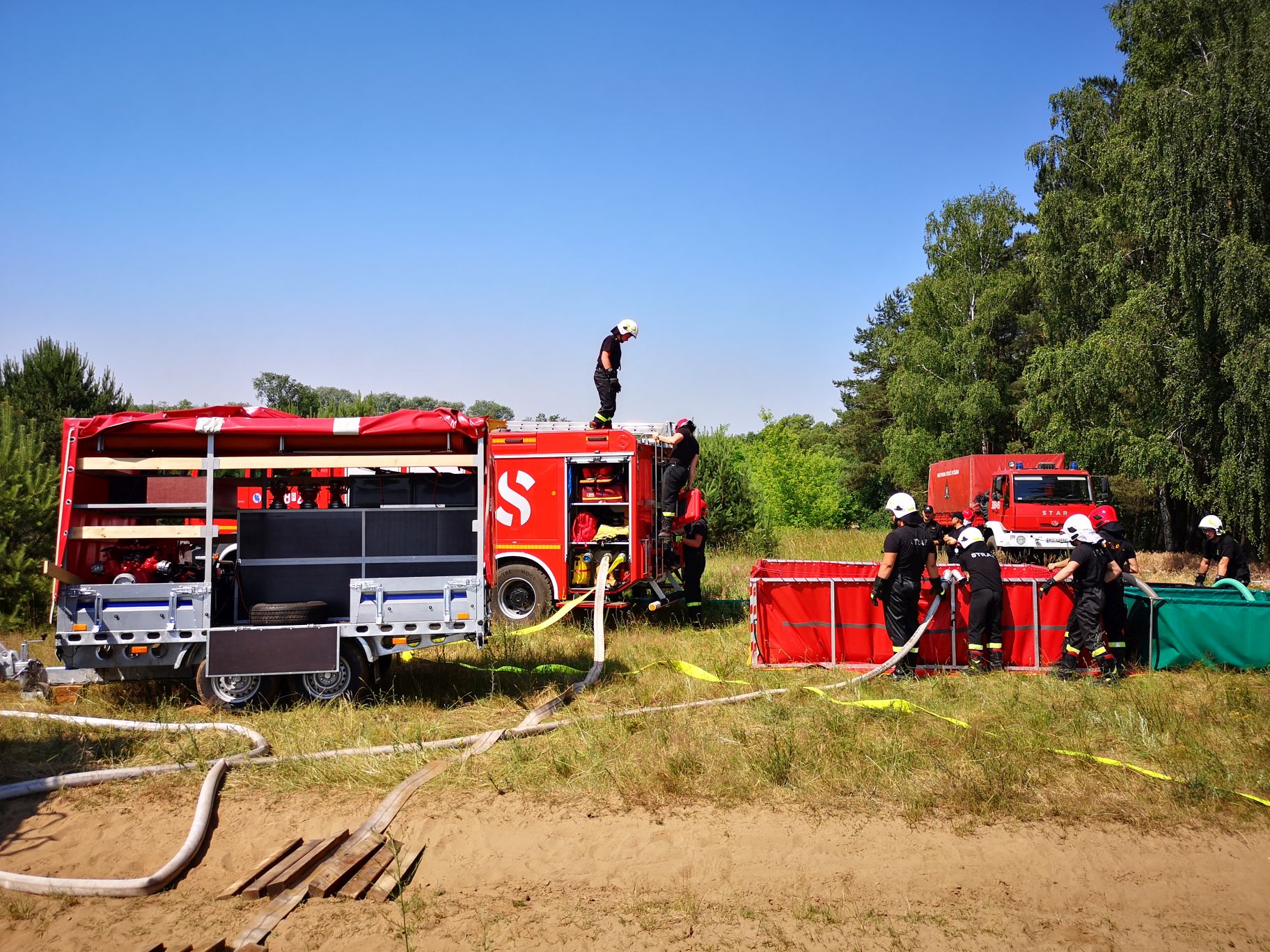 W dniach 12.06.2021r. i 19.06.2021r. w rejonie operacyjnym Jednostki Ratowniczo - Gaśniczej nr 8 odbyły się ćwiczenia z zakresu budowania punktu czerpania wody (PCW) oraz dostarczania wody na duże odległości podczas działań gaśniczych.