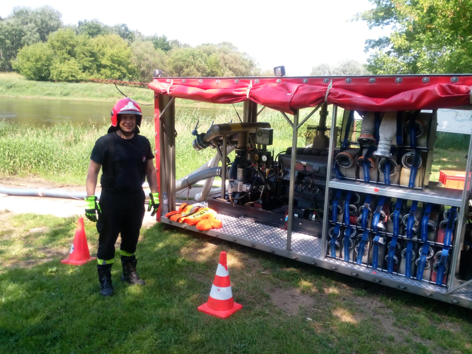 Kolejna sobota tj. 19.06.2021r. upłynęła pod znakiem ćwiczeń w w/w tematyce w rejonie przystani kajakowej Binduga w Mściszewie. Tym razem strażacy z JRG 8 ćwiczyli wspólnie z jednostkami OSP Murowana Goślina, OSP Białężyn, OSP Boduszewo, OSP Rakownia, OSP Długa Goślina, OSP Nieszawa oraz OSP Uchorowo. W ćwiczeniach uczestniczył również Zastępca Komendanta Miejskiego PSP w Poznaniu mł. bryg. Radosław Hurnik. Cel ten sam, warunki pogodowe i terenowe zgoła inne. Jako PCW wykorzystano rzekę Wartę, a wodę należało dostarczyć do stanowisk gaśniczych oddalonych od PCW ok. 1km. Na ćwiczenia przybył także Burmistrz MiG Murowana Gośliny Dariusz Urbański ze swoim Zastępcą Radosławem Szpotem, którzy mieli okazję osobiście obserwować nasze działania i zapoznać się z ich specyfiką.