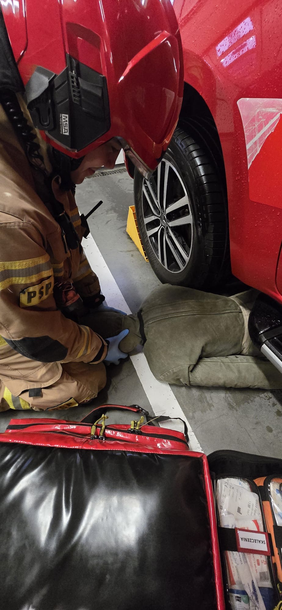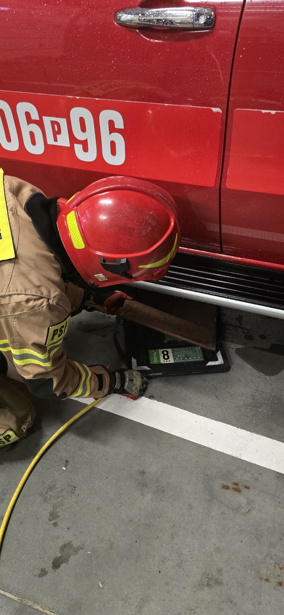 Działania strażaków rozpoczęły się od zabezpieczenia miejsca zdarzenia i oceny stanu poszkodowanego. Strażacy z JRG nr 2 wykorzystali specjalistyczny sprzęt pneumatyczny – poduszki wysokociśnieniowe, które umożliwiły uniesienie pojazdu w sposób bezpieczny i kontrolowany. Równolegle prowadzono ciągły monitoring stanu zdrowia poszkodowanego, a ratownicy wyznaczeni do działań medycznych przygotowywali miejsce do ewakuacji poszkodowanego i udzielenia mu dalszej pomocy medycznej.