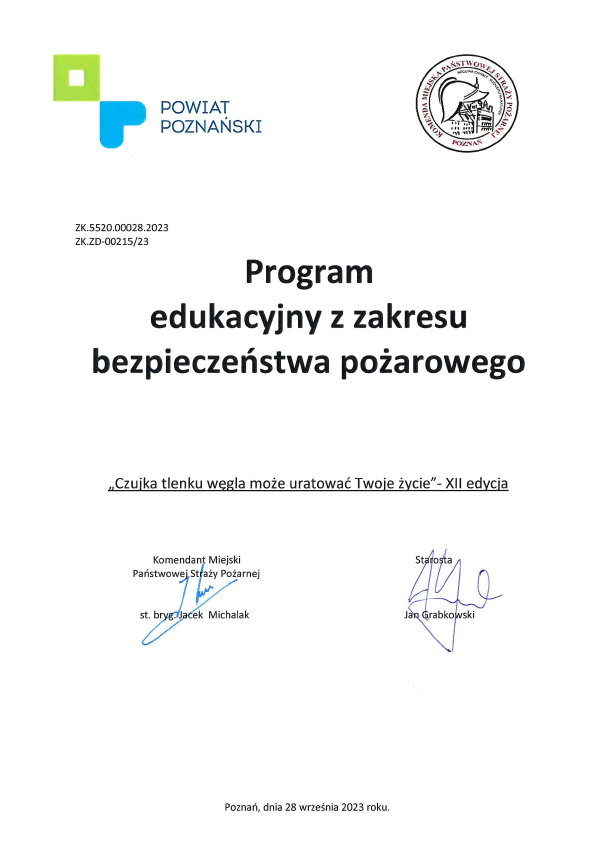 1 października powiat poznański wraz z Komendą Miejską Państwowej Straży Pożarnej w Poznaniu dwunasty raz zainaugurował program edukacyjny z zakresu bezpieczeństwa pożarowego „Czujka tlenku węgla może uratować Twoje życie”.