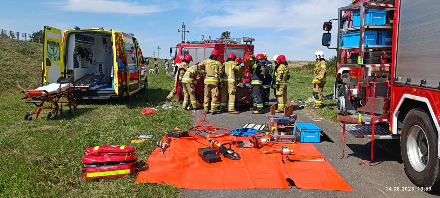 Po przybyciu na miejsce zdarzenia zastano samochód osobowy po dachowaniu, w którym znajdowała się poszkodowana kobieta. Działania straży pożarnej polegały na zabezpieczeniu miejsca zdarzenia, wykonaniu dostępu do osoby poszkodowanej przy użyciu narzędzi hydraulicznych, udzieleniu kwalifikowanej pierwszej pomocy oraz ewakuacji kobiety z auta na noszach typu deska.