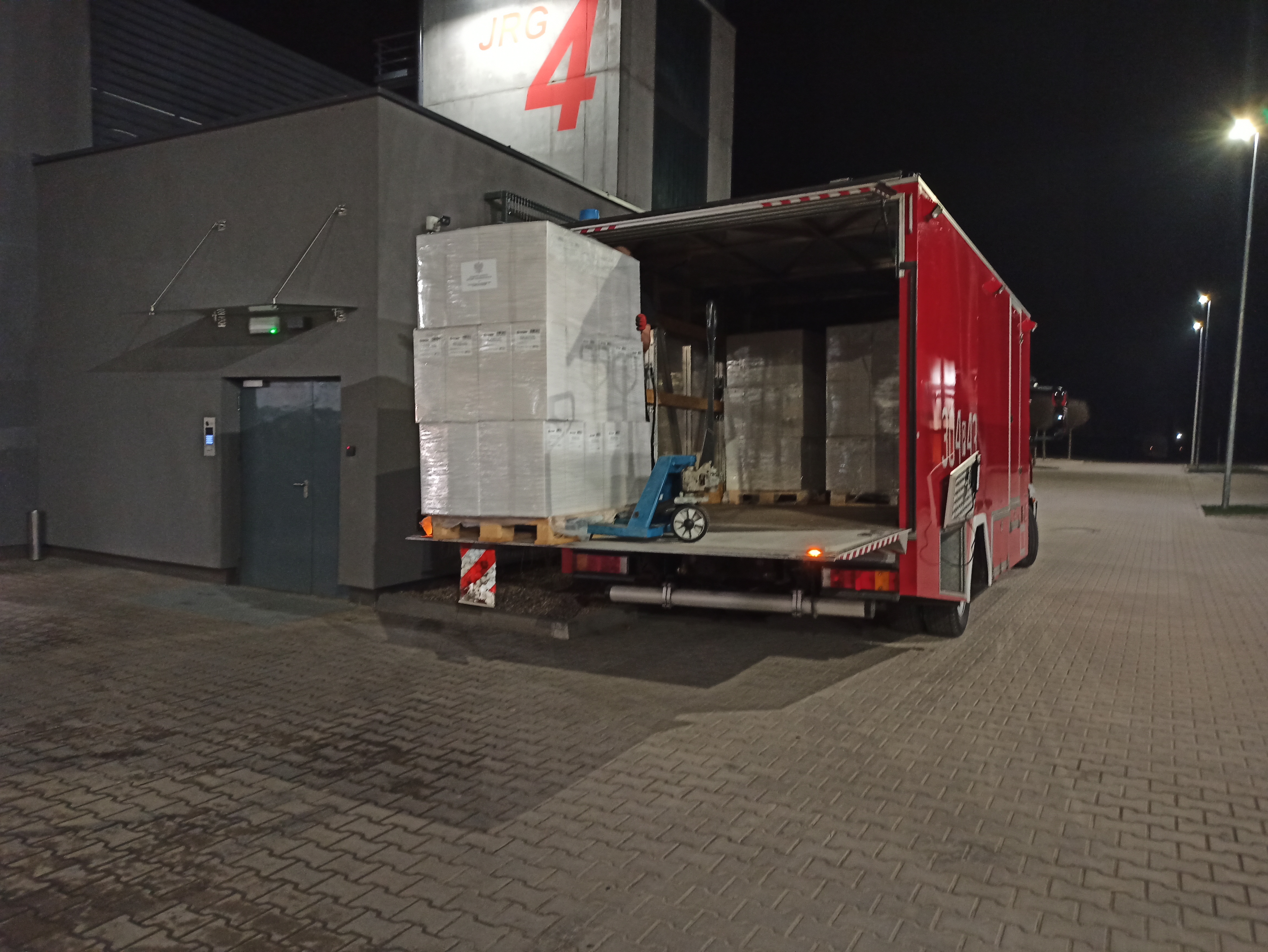 Dostawa prowadzona była zAgencji Rezerw Materiałowych. Strażacy rozładowali 28 palet maseczek trójwarstwowych o łącznej ilości 1 008 000 sztuk.