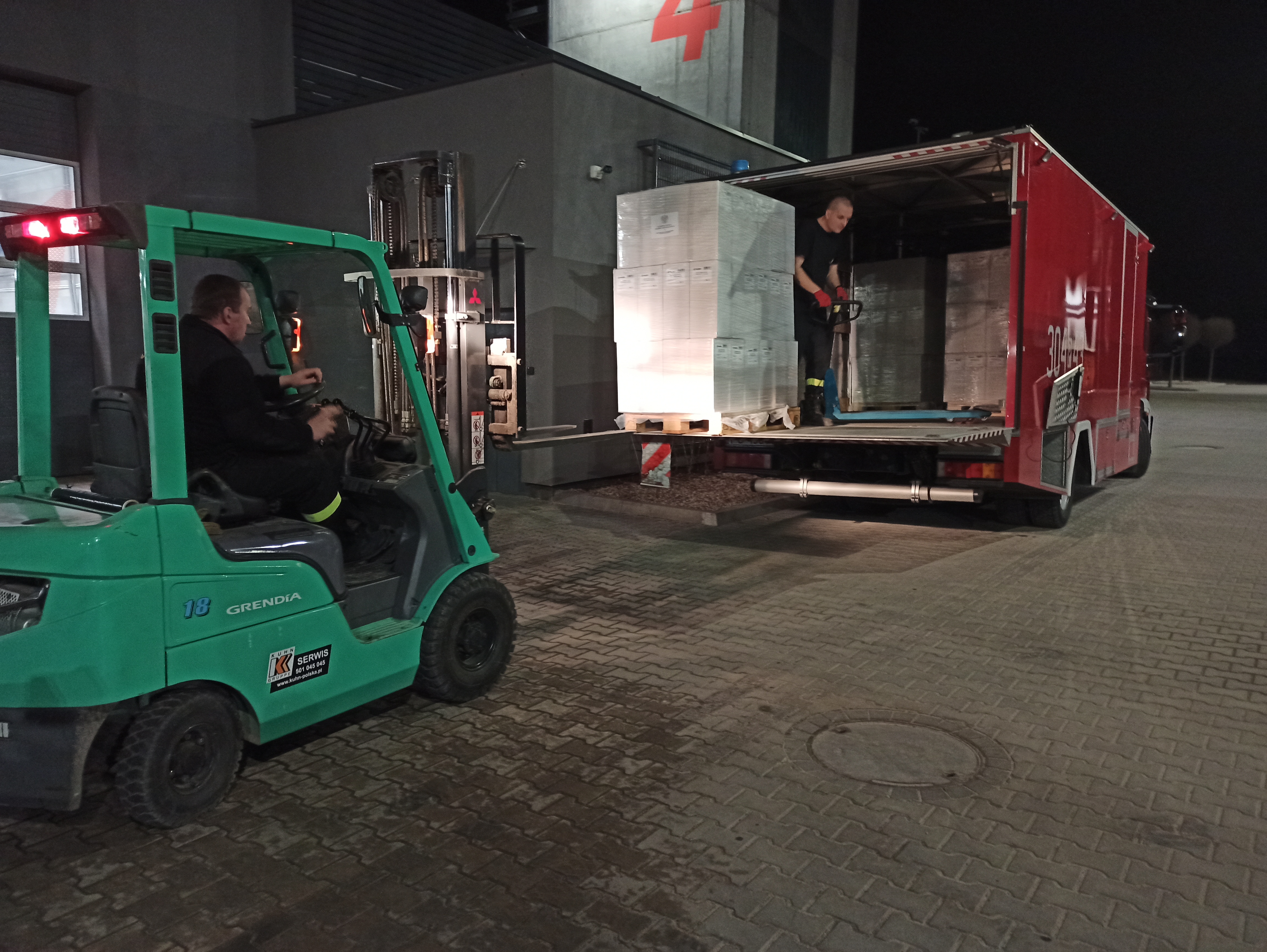 Dodatkowo JRG 4 posiada Bank Tlenu, z którego w razie potrzeby transportowane są butle do okolicznych szpitali. Tego wieczora strażacy rozładowali łącznie 50 sztuk butli z tlenem o pojemności 50 litrów, oraz 40 sztuk butli o pojemności 40 litrów.