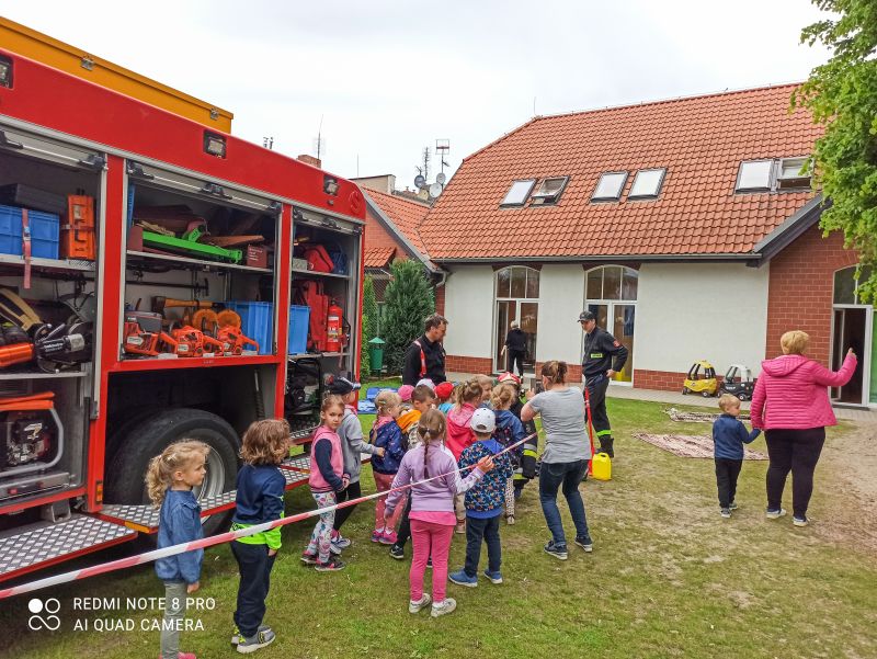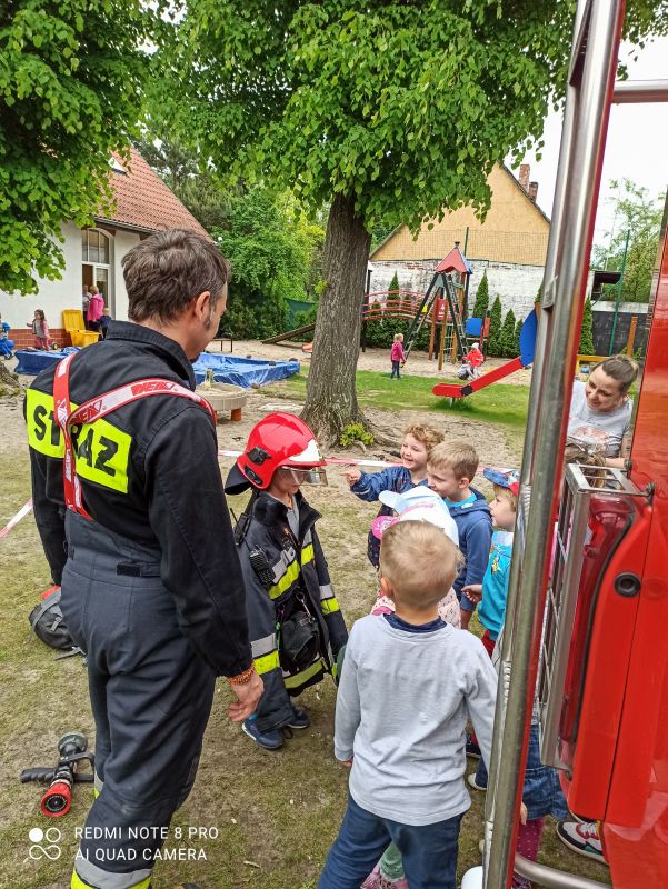 Mali przedszkolacy zobaczyli jak wygląda ubiór strażaka m.in. ubranie bojowe, aparat ochrony dróg oddechowych. Atrakcją była możliwość ubrania się w strój strażaka. Na koniec spotkania dzieci zostały zaproszone do Jednostki Ratowniczo - Gaśniczej, żeby móc obejrzeć sprzęt jakim dysponują strażacy w Mosinie.