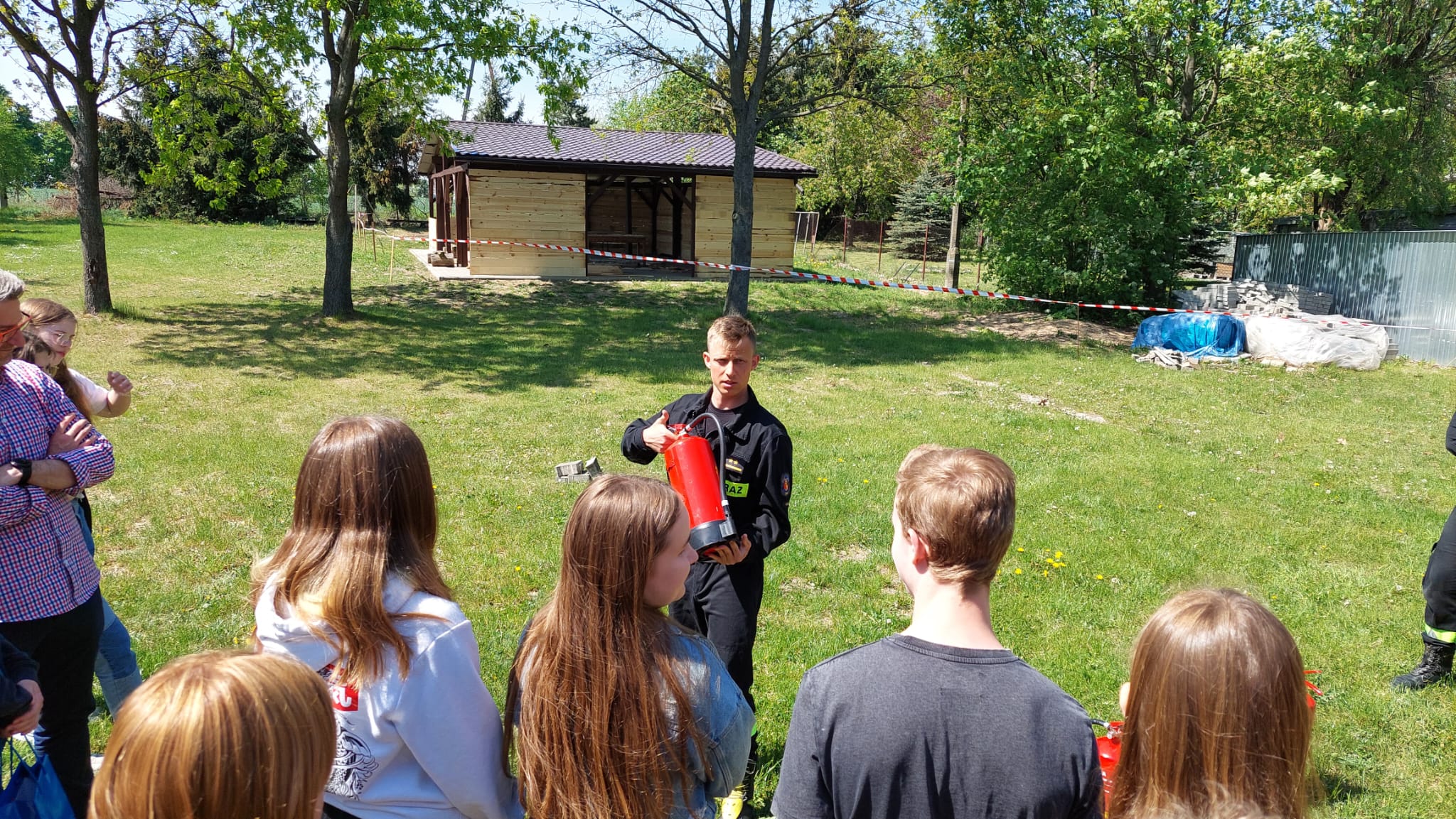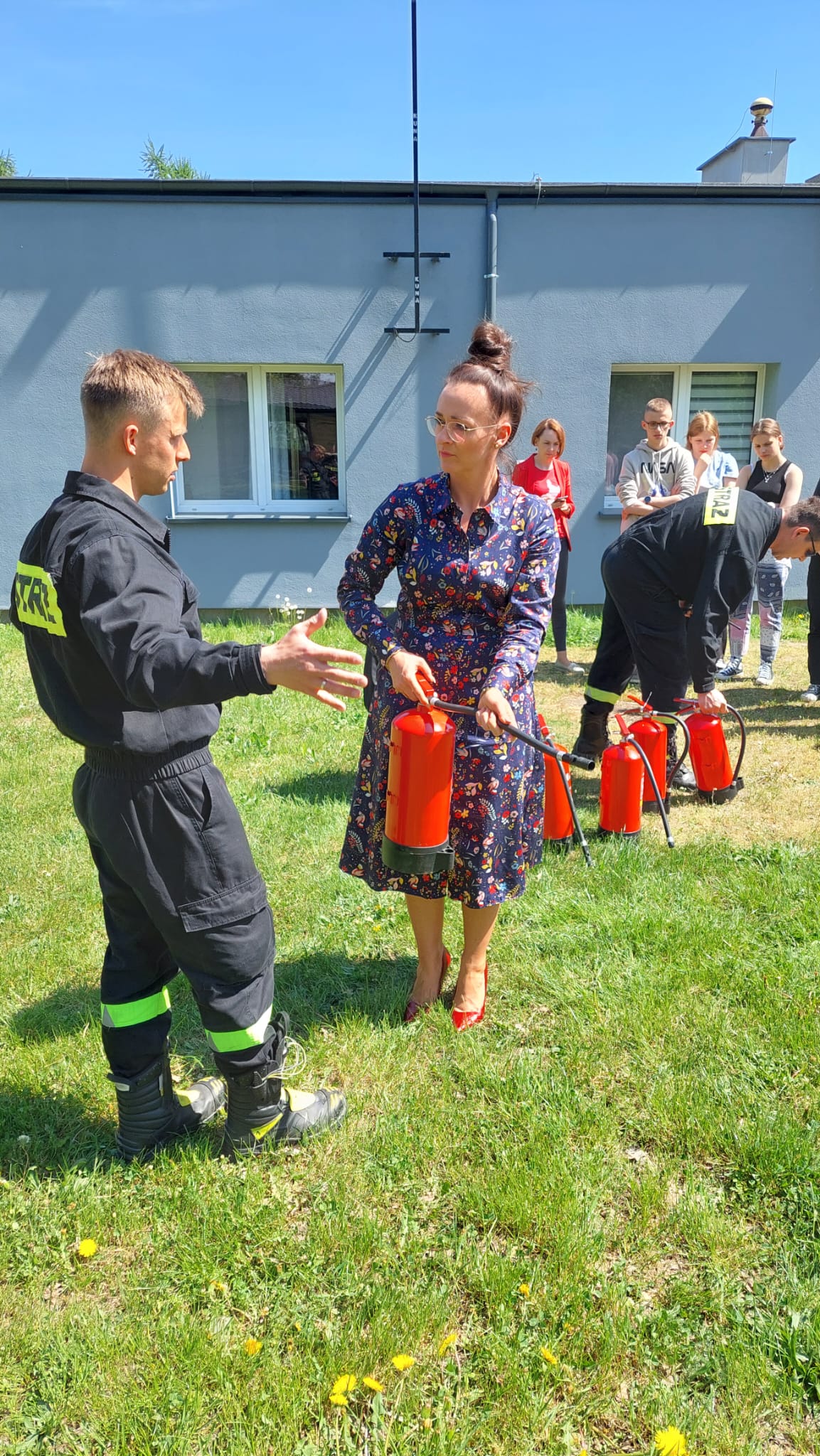 Elementem dodatkowym dla powiększenia wiedzy z ochrony przeciwpożarowej było przedstawienie zasad podstawowego urządzenia do zwalczania pożaru jakim jest gaśnica. Każdy z uczestników mógł w praktyce spróbować swoich sił w użyciu podręcznego sprzętu gaśniczego.