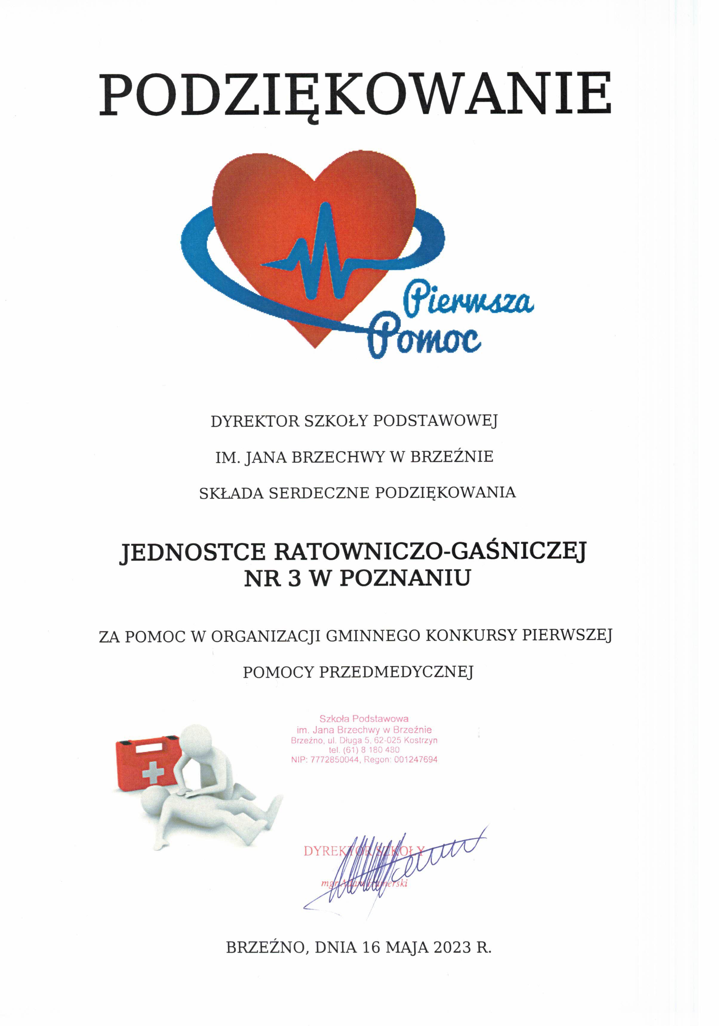 Dnia 16 maja 2023 r. w sali OSP Brzeźno odbył się coroczny Gminny Turniej Pierwszej Pomocy, który miał na celu zweryfikowanie wiedzy teoretycznej oraz umiejętności praktycznych udzielania pomocy przedmedycznej przez młodzież z Gminy Kostrzyn. Turniej rozpoczął się testem wiedzy składającym się z 21 pytań, przygotowanym przez strażaków z JRG 3. Z kolei część praktyczną stanowiło pięć przygotowanych scen, odzwierciedlających prawdziwe sytuacje zagrożenia życia.