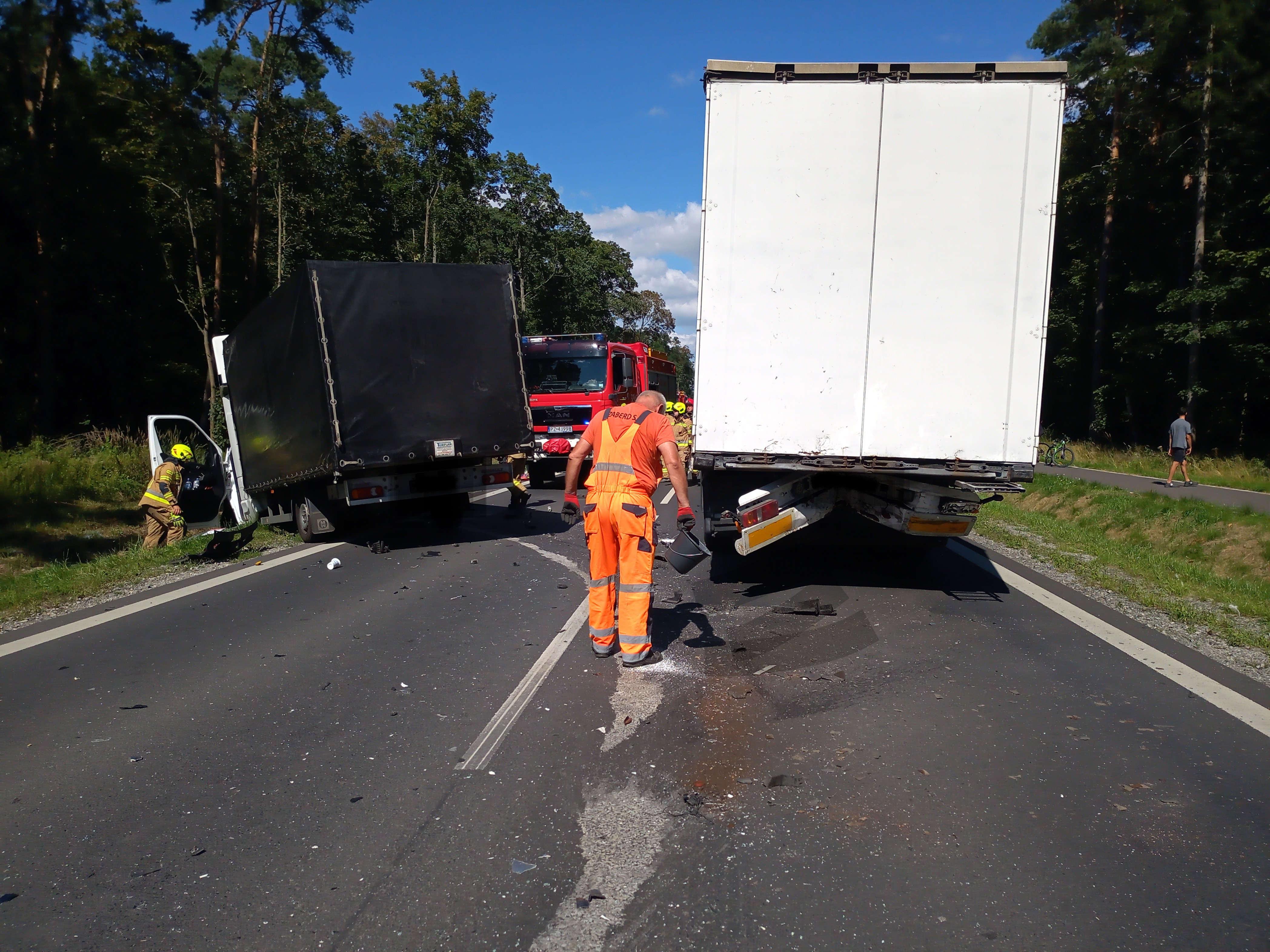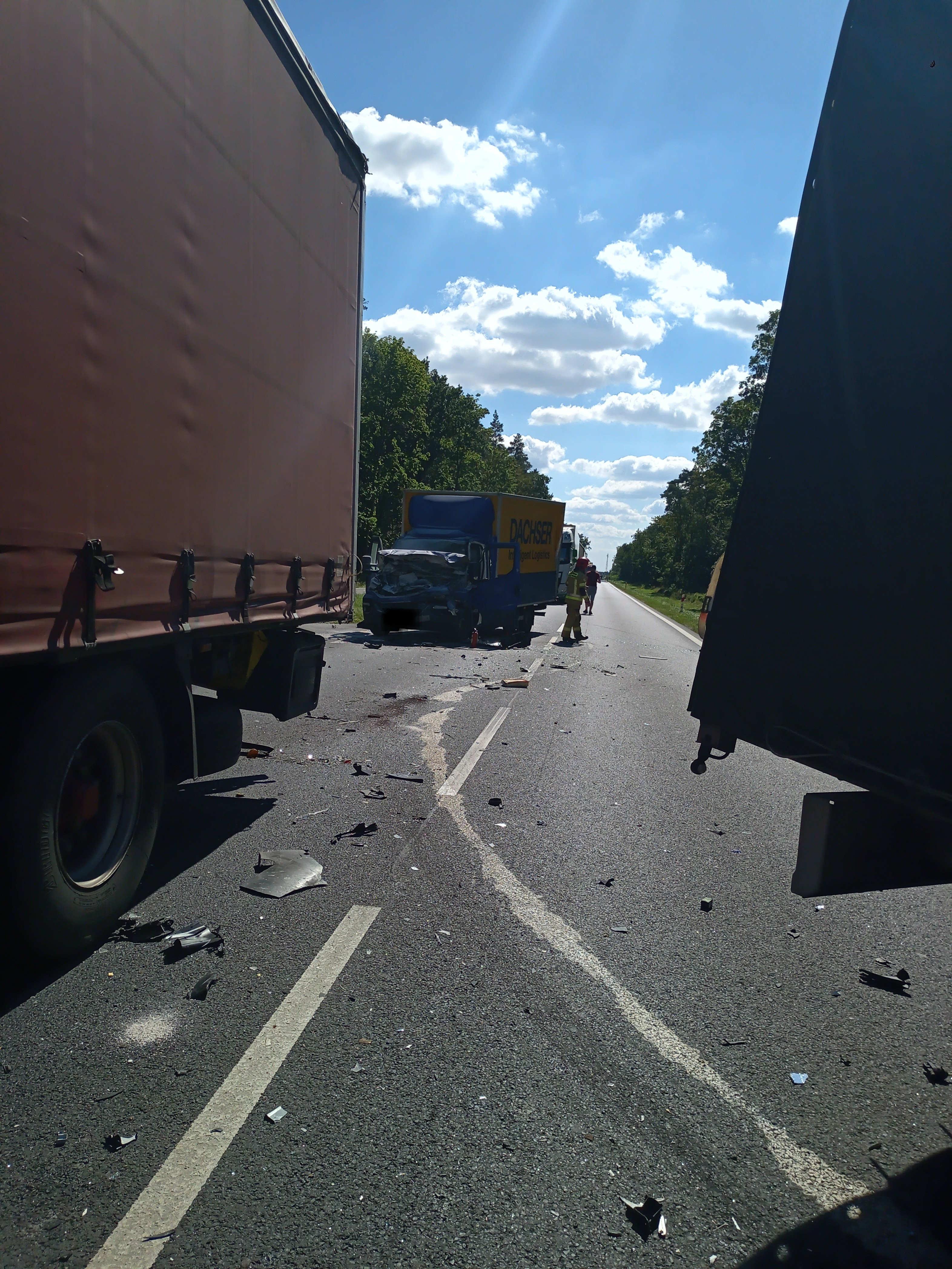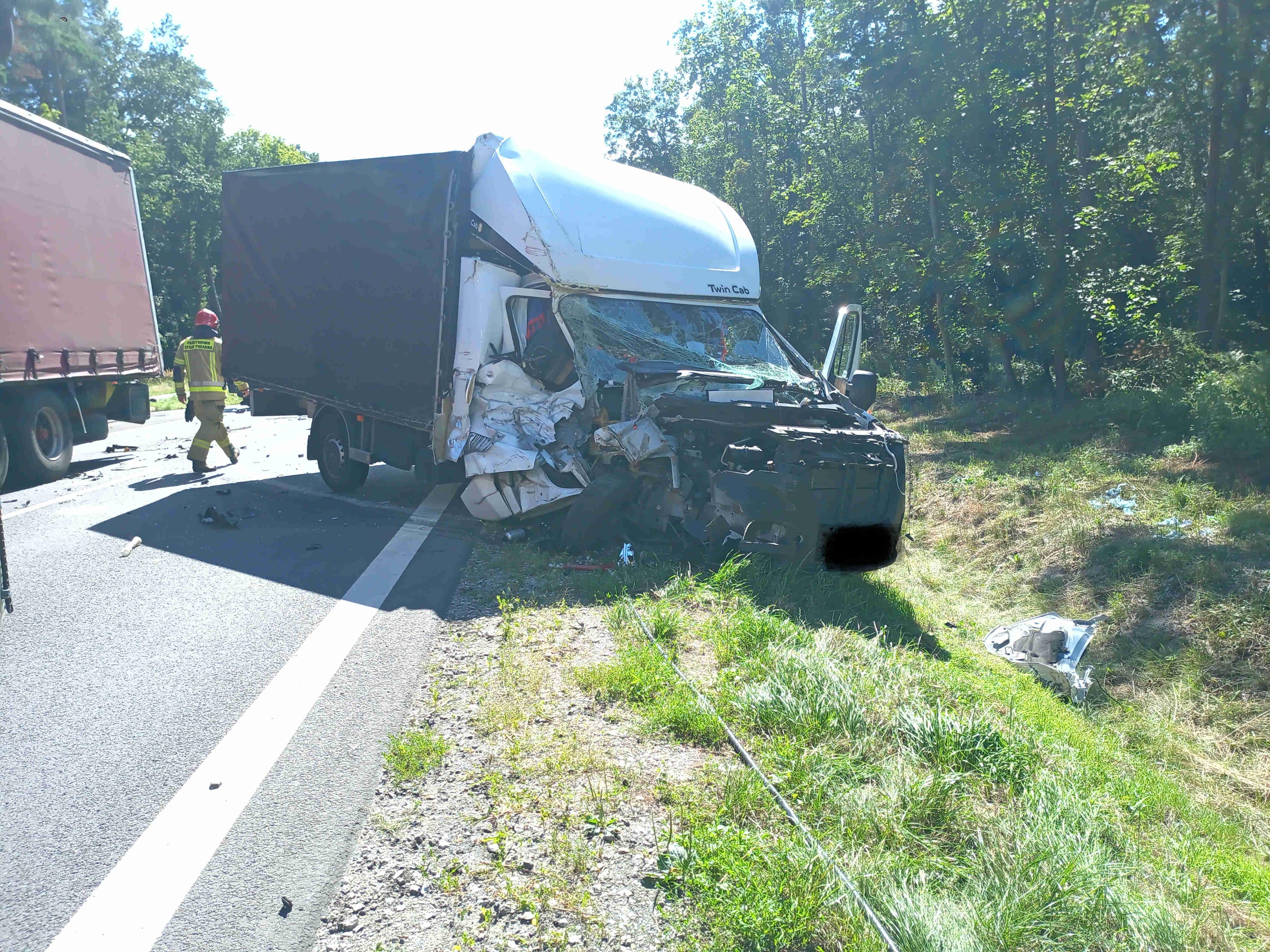 W zderzeniu udział brały dwa pojazdy dostawcze i ciągnik siodłowy z naczepą. Spod maski jednego z pojazdów wydobywał się dym, który został szybko ugaszony przez jednostki ochrony przeciwpożarowej. Szczęśliwie żaden z kierujących nie odniósł obrażeń, nikt nie został przewieziony do szpitala. W trakcie prowadzenia działań droga została zamknięta w obu kierunkach. Dopiero po zakończeniu działań przez Policję usunięto pojazdy na pobocze, udrażniając jeden pas ruchu. Ruchem wahadłowym kierowała Policja. Wykonano sorpcje płynów eksploatacyjnych z jezdni.
