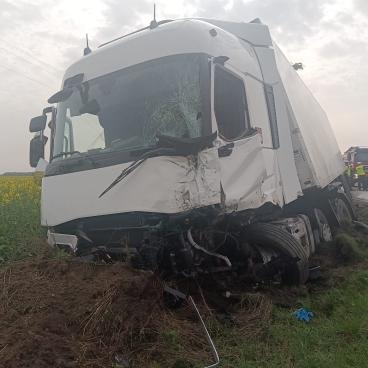 Miał tam miejsce wypadek dwóch pojazdów – Mercedesa (van) oraz ciągnika siodłowego Renault wraz z naczepą. W zdarzeniu brały udział 2 osoby. Pierwsi przybyli druhowie z OSP Strykowo, podjęli trudne działania wydobycia uwięzionego kierowcy pojazdu osobowego, wykorzystaniem sprzętu hydraulicznego. Strażacy udzielili Kwalifikowanej Pierwszej Pomocy oraz medycznych czynności ratunkowych osobom biorącym udział w zdarzeniu. Równolegle prowadzone były działania mające na celu bezpośrednie zabezpieczenie pojazdów a także zajęto się sorpcją rozlanych płynów eksploatacyjnych. Ruch na zabezpieczonym odcinku był całkowicie zablokowany. Po przebadaniu przez przybyłe Zespoły Ratownictwa Medycznego, obie osoby biorące udział w wypadku zostały przetransportowane do szpitala. Na miejscu lądował również śmigłowiec Lotniczego Pogotowia Ratunkowego.