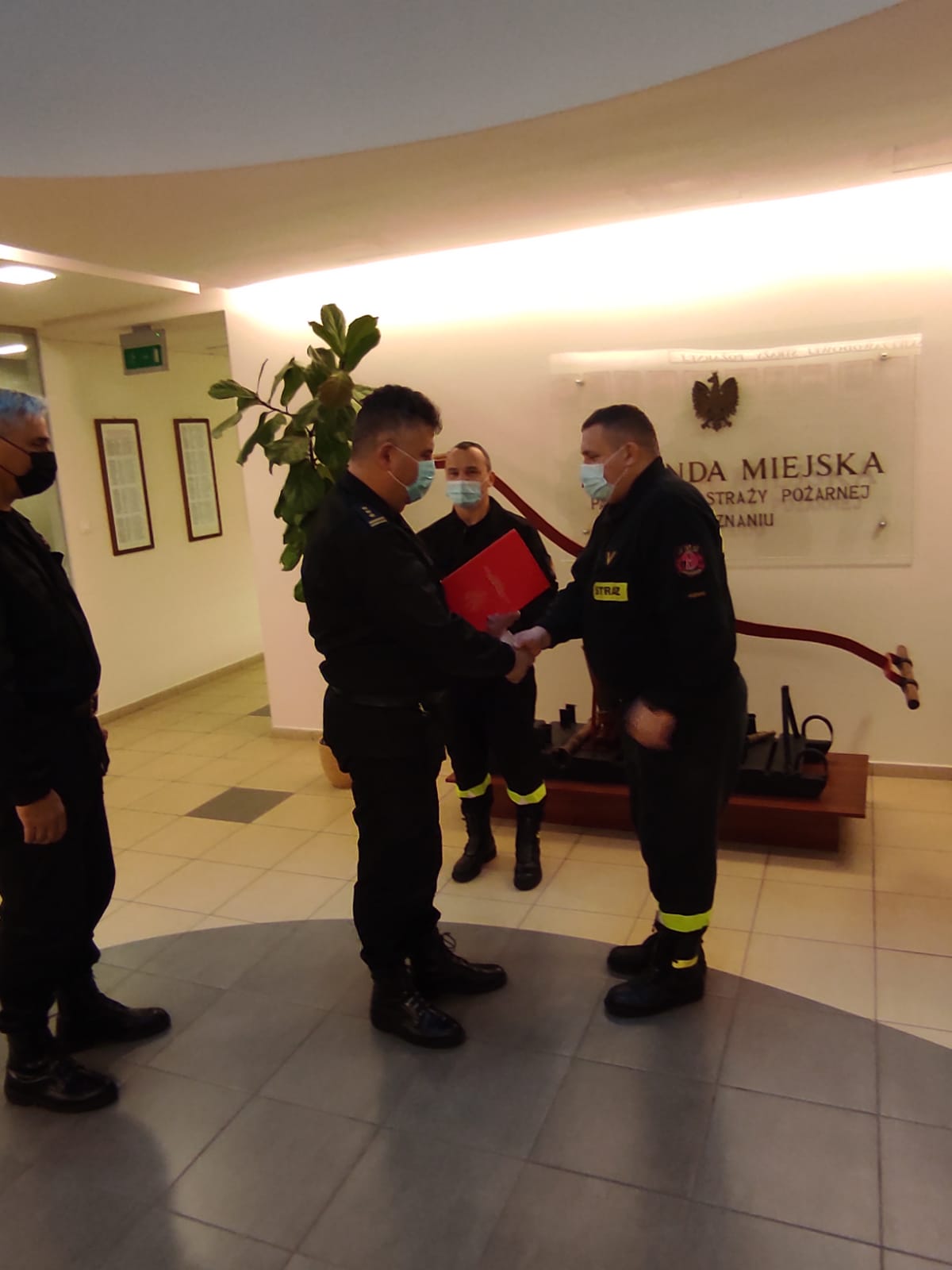 Komendant Miejski st. bryg. Jacek Michalak wręczył nagrody jubileuszowe funkcjonariuszom Jednostki Ratowniczo - Gaśniczej nr 9, zastępcy dowódcy zmiany asp. sztab. Pawłowi Ruskowiakowi oraz starszemu ratownikowi ogn. Zbigniewowi Jagłowskiemu za 25 lat pracy i służby.