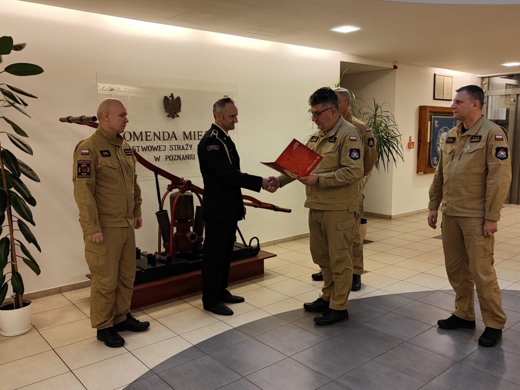 Dnia 21 listopada 2023 r. Komendant Miejski Państwowej Straży Pożarnej w Poznaniu st. bryg. Jacek Michalak, w obecności Zastępców Komendanta – st. bryg. Radosława Hurnika, st. bryg. Damiana Jankowiaka oraz Dowódcy Jednostki Ratowniczo-Gaśniczej nr 9 st. kpt. Pawła Zielińskiego, wręczył nagrodę jubileuszową:
