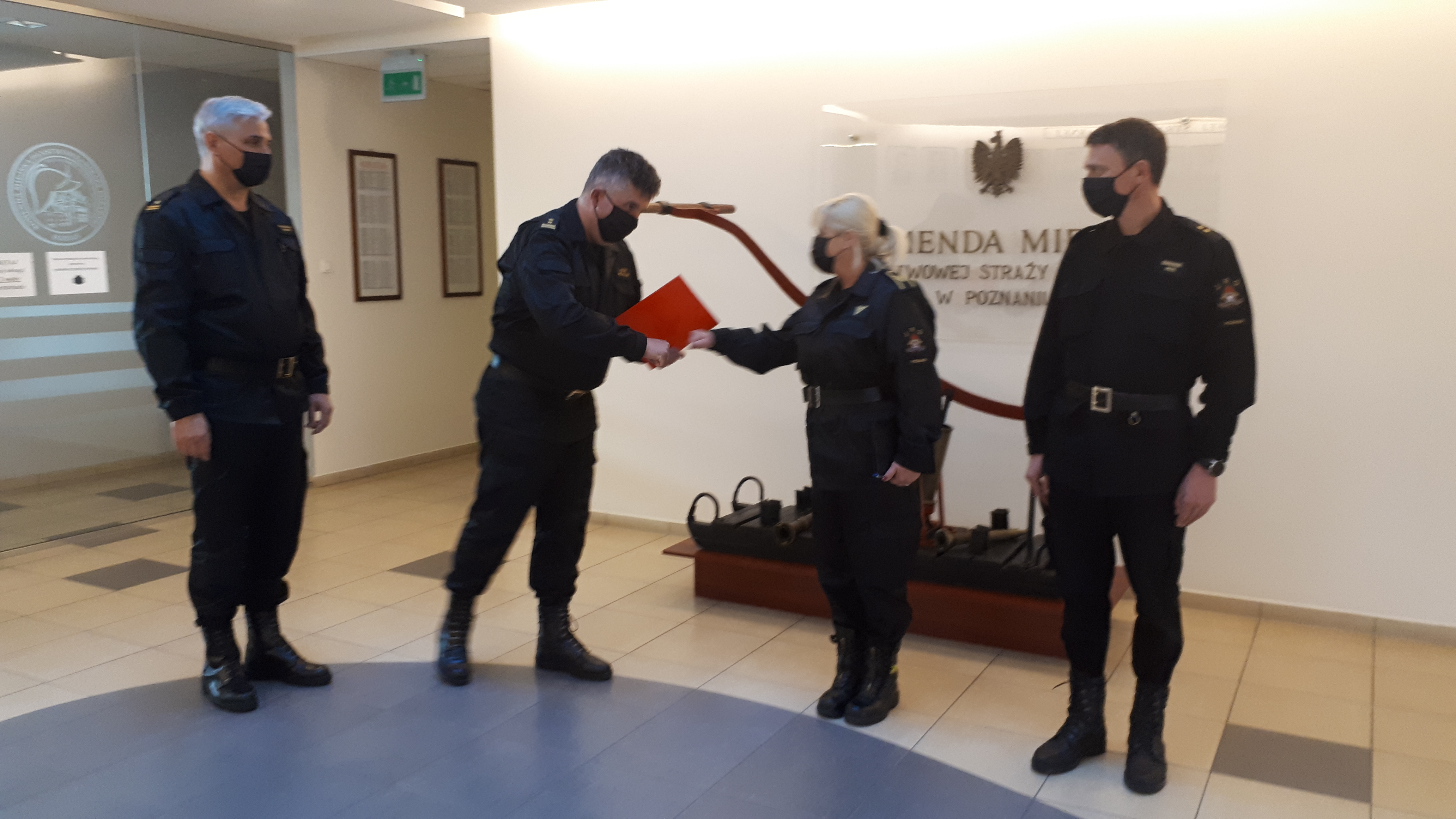 W dniu 23 kwietnia 2021r. Komendant Miejski bryg. Jacek Michalak w obecności Zastępcy Komendanta – mł.bryg. Radosław Hurnika oraz Zastępcy Dowódcy JRG 4 – mł.kpt. Piotra Borkowskiego wręczył nagrodę jubileuszową funkcjonariuszce Jednostki Ratowniczo - Gaśniczej nr 4 st.ogn. Magdalenie Nowickiej - Błażejczyk za 25 lat pracy. Przy okazji wręczenia decyzji pogratulował funkcjonariuszce za wzorową i nienaganną służbę oraz życzył wielu sukcesów w kolejnych latach służby.