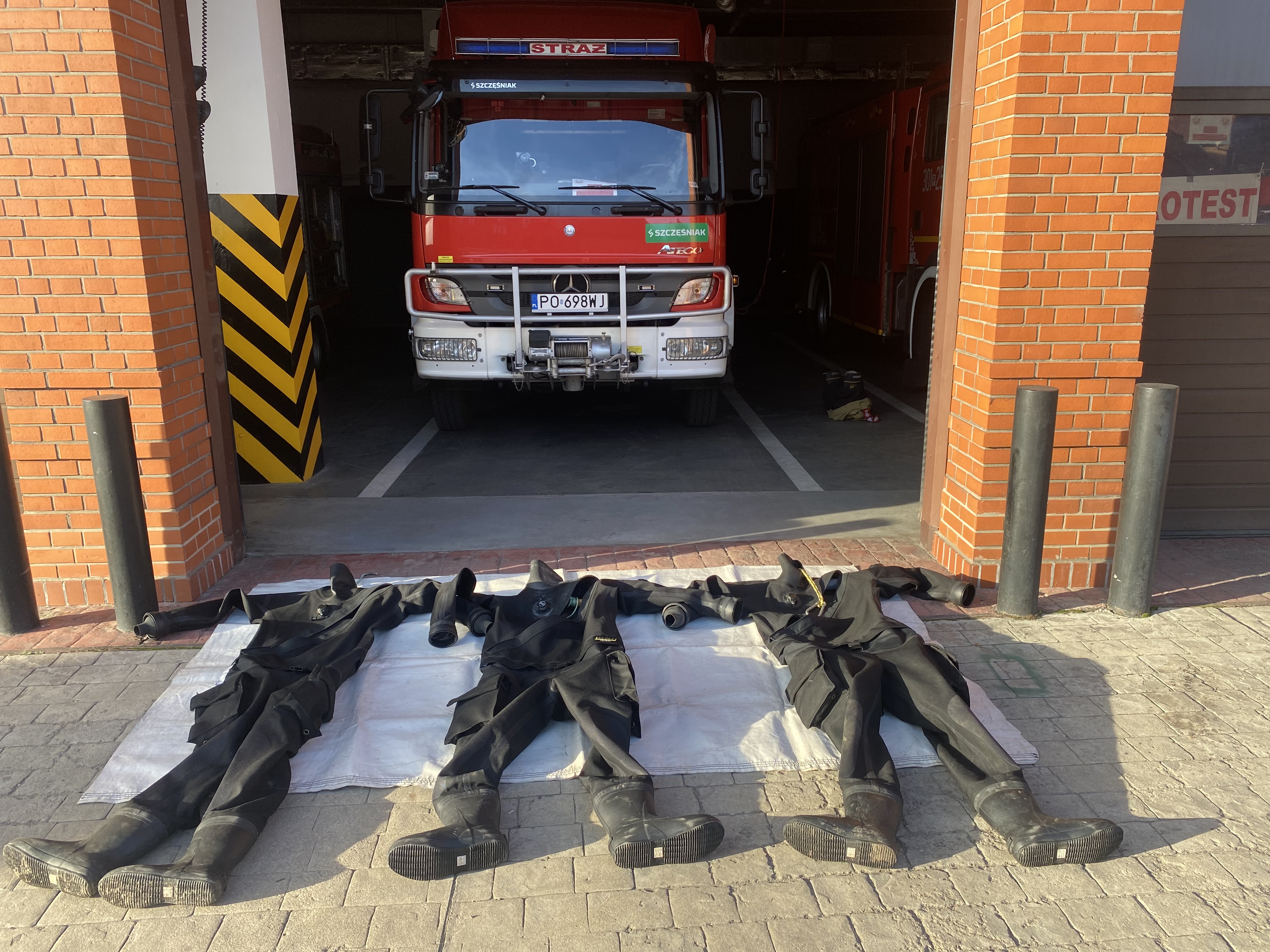 W ramach zakupu 8 kpl. nowych skafandrów nurkowych Specjalistyczna Grupa Wodno-Nurkowa dokonała wymiany wysłużonych indywidualnych ubrań nurkowych. Zakupione skafandry izolują nurka przed kontaktem ze środowiskiem wodnym, dając komfort termiczny i stanowi również element bezpieczeństwa przed utonięciem, jak również chroni strażaka przed uszkodzeniem ciała poprzez przetarcia czy przebicia przez elementy i obiekty znajdujące się w wodzie. Ubrania zostały wykonane z bardzo wytrzymałych materiałów i pozwalają wykonywać prace podwodne w najtrudniejszych warunkach. Korzystanie z tak profesjonalnego i dobrze dobranego sprzętu zwiększa bezpieczeństwo jak i komfort nurków podczas akcji ratowniczych oraz ćwiczeń.