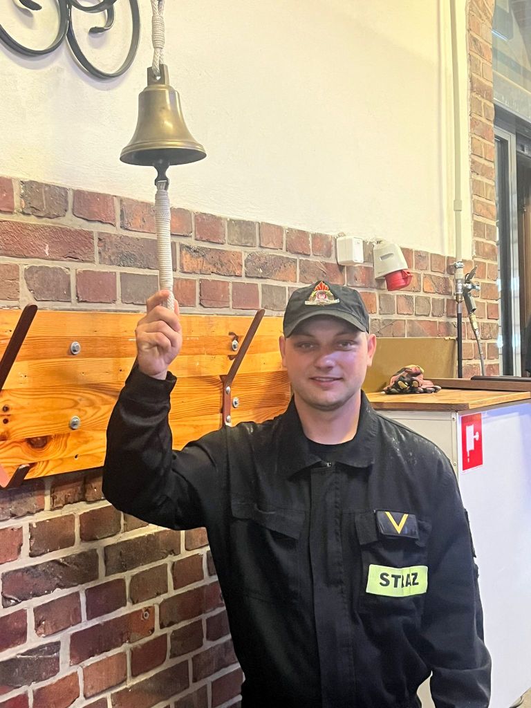 Po zmianie służby ogn. Dawid Twardowski tradycyjnie zabił w dzwon symbolizujący przekazanie służby. Dziękujemy za wspólnie spędzony czas i przepracowane razem lata. Życzymy funkcjonariuszowi spokoju i szczęśliwego czasu w nowej Jednostce i w życiu prywatnym.