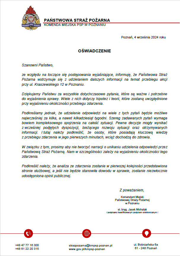 Oświadczenie Komendanta Miejskiego Państwowej Straży Pożarnej w Poznaniu z 4 września 2024 r.