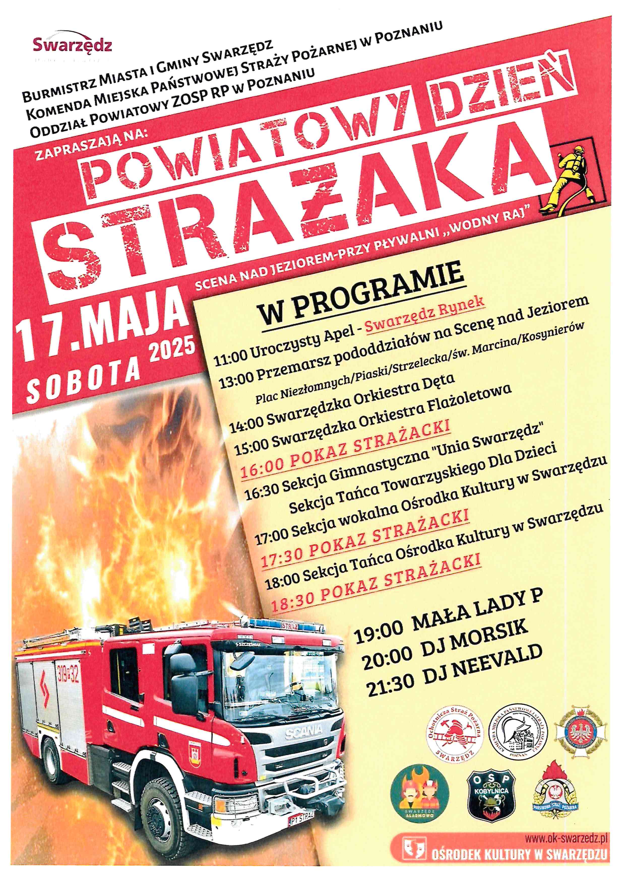 Komenda Miejska Państwowej Straży Pożarnej w Poznaniu, Oddział Powiatowy Związku Ochotniczych Straży Pożarnych Rzeczypospolitej Polskiej oraz Burmistrz Miasta i Gminy Swarzędz zapraszają na Powiatowe Obchody Dnia Strażaka, które odbędą się 17 maja 2025 r. na Swarzędzkim Rynku.