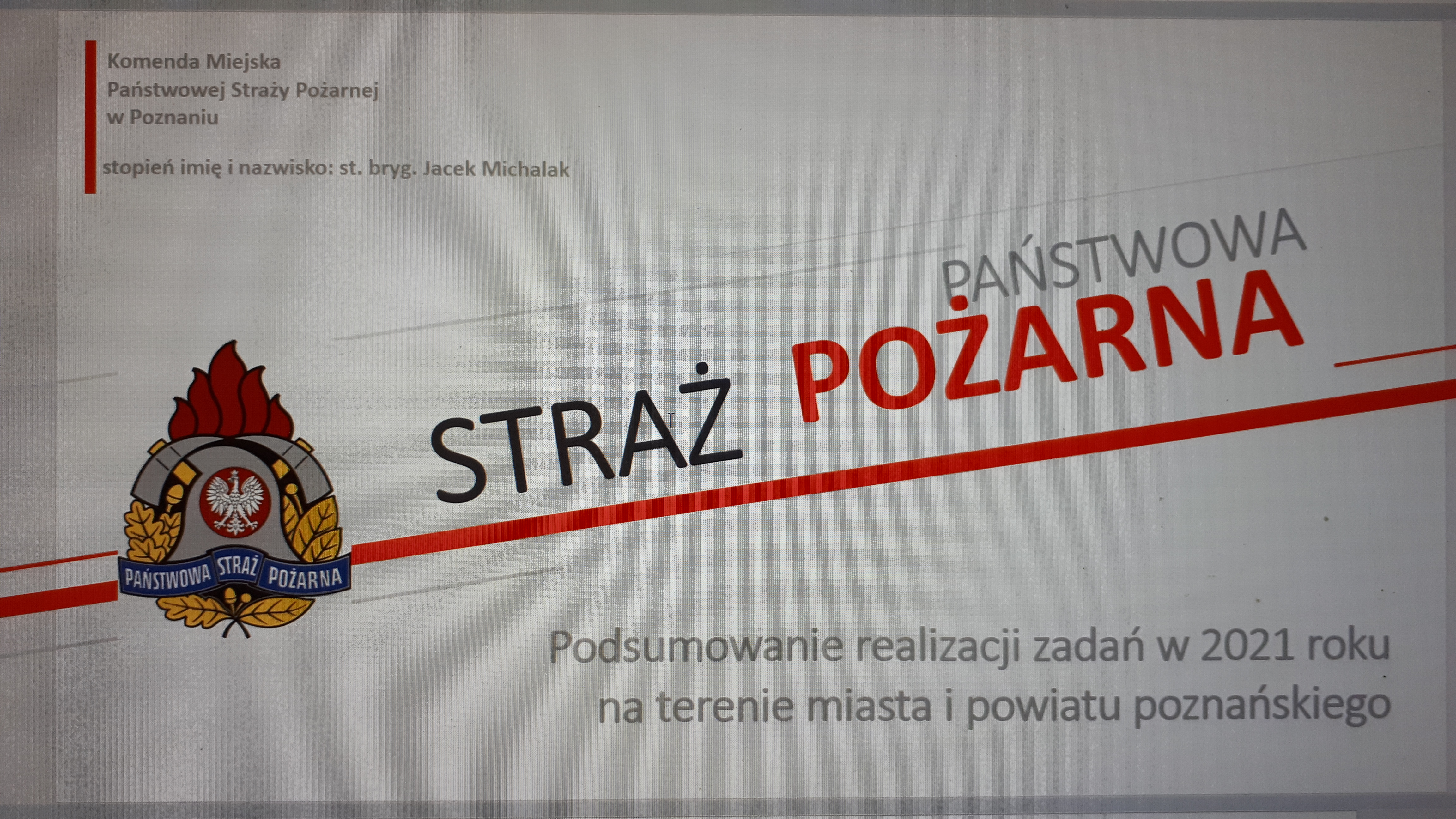 W dniu 15 lutego 2022r. w siedzibie Komendy Miejskiej PSP w Poznaniu odbyła się w formie online pierwsza część narady rocznej podsumowująca działalność poznańskiej komendy w roku 2021. Udział w niej wzięli kadra kierownicza KM PSP Poznań oraz kierownicy komórek organizacyjnych. Sprawozdanie z działalności w mijającym roku przedstawiły w formie prezentacji wszystkie wydziały, samodzielne stanowiska a także dziewięć jednostek ratowniczo-gaśniczych.