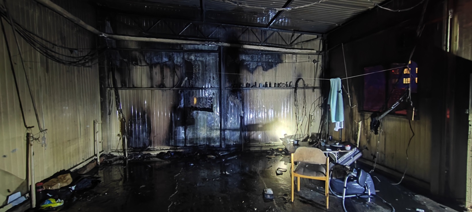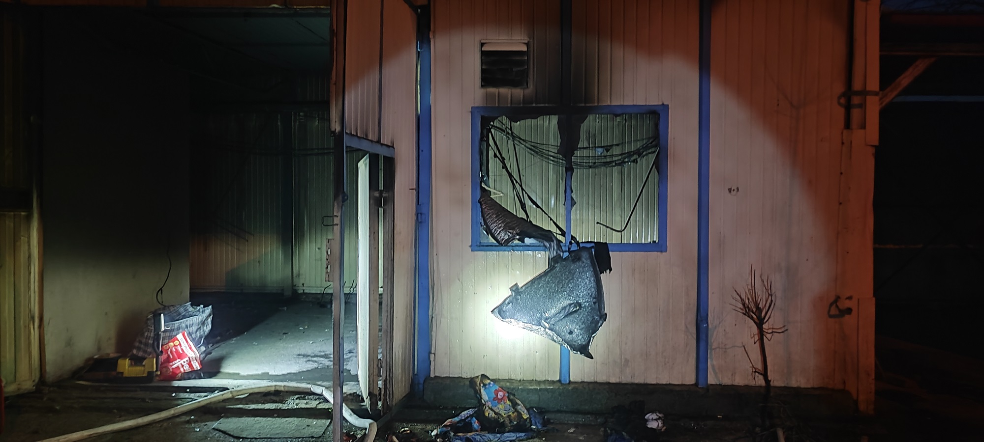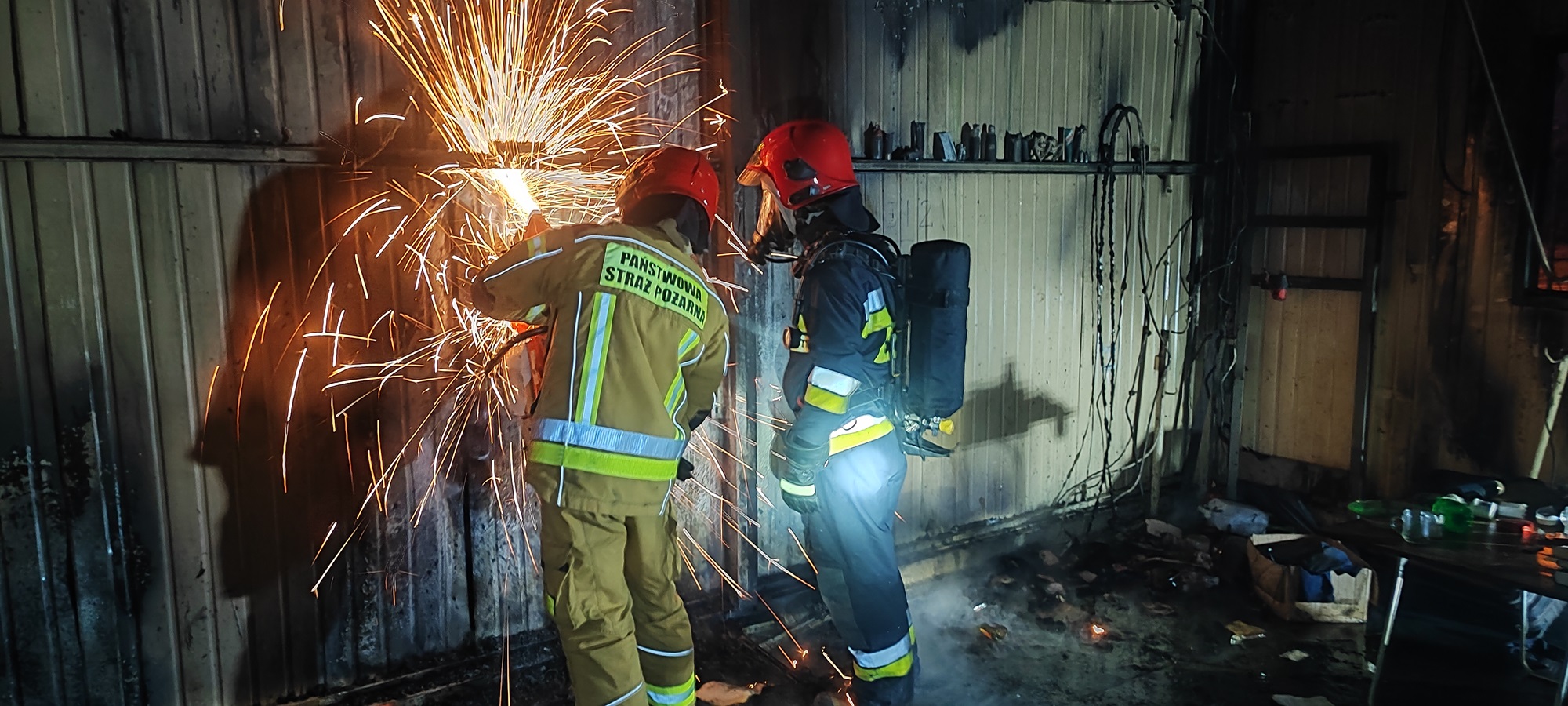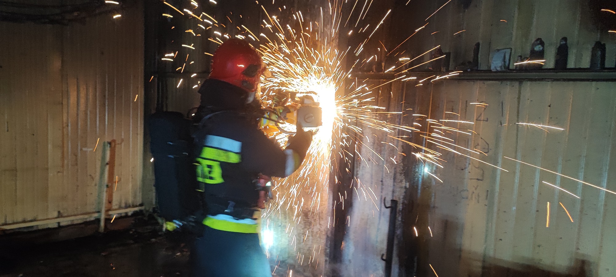 Po dojeździe na miejsce zdarzenia okazało się, że pożarem objęte jest pomieszczenie w parterowym blaszanym baraku o powierzchni około 100 m2. Działania strażaków w pierwszej fazie akcji polegały na przeszukaniu budynku pod kątem odnalezienia ewentualnych osób poszkodowanych. Jednocześnie prowadzono czynności mające na celu ugaszenie pożaru i zatrzymanie rozprzestrzeniania się ognia. Po opanowaniu pożaru przystąpiono do dogaszenia materiału palnego znajdującego się w pomieszczeniu, następnie sprawdzono teren pogorzeliska przy użyciu kamery termowizyjnej. Wentylatorem oddymiającym przewietrzono miejsce, w którym powstał pożar jak również pomieszczenia sąsiednie. Na miejscu akcji pojawiła się Policja, która będzie ustalała do kogo należy budynek oraz okoliczności powstania zdarzenia.