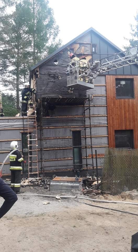 W dniu 20 sierpnia br. w godzinach porannych na numer alarmowy 998 wpłynęło zgłoszenie o pożarze domu w budowie w miejscowości Kamińsko. Do zdarzenia zadysponowane zostały w pierwszej kolejności dwa zastępy gaśnicze z Jednostki Ratowniczo-Gaśniczej nr 8 w Bolechowie. Po przybyciu strażaków na miejsce zdarzenia i przeprowadzeniu rozpoznania stwierdzono, że pali się elewacja budynku mieszkalnego. Dowódca akcji poprosił o zadysponowanie kolejnych sił i środków, w tym drabiny mechanicznej z JRG-3.