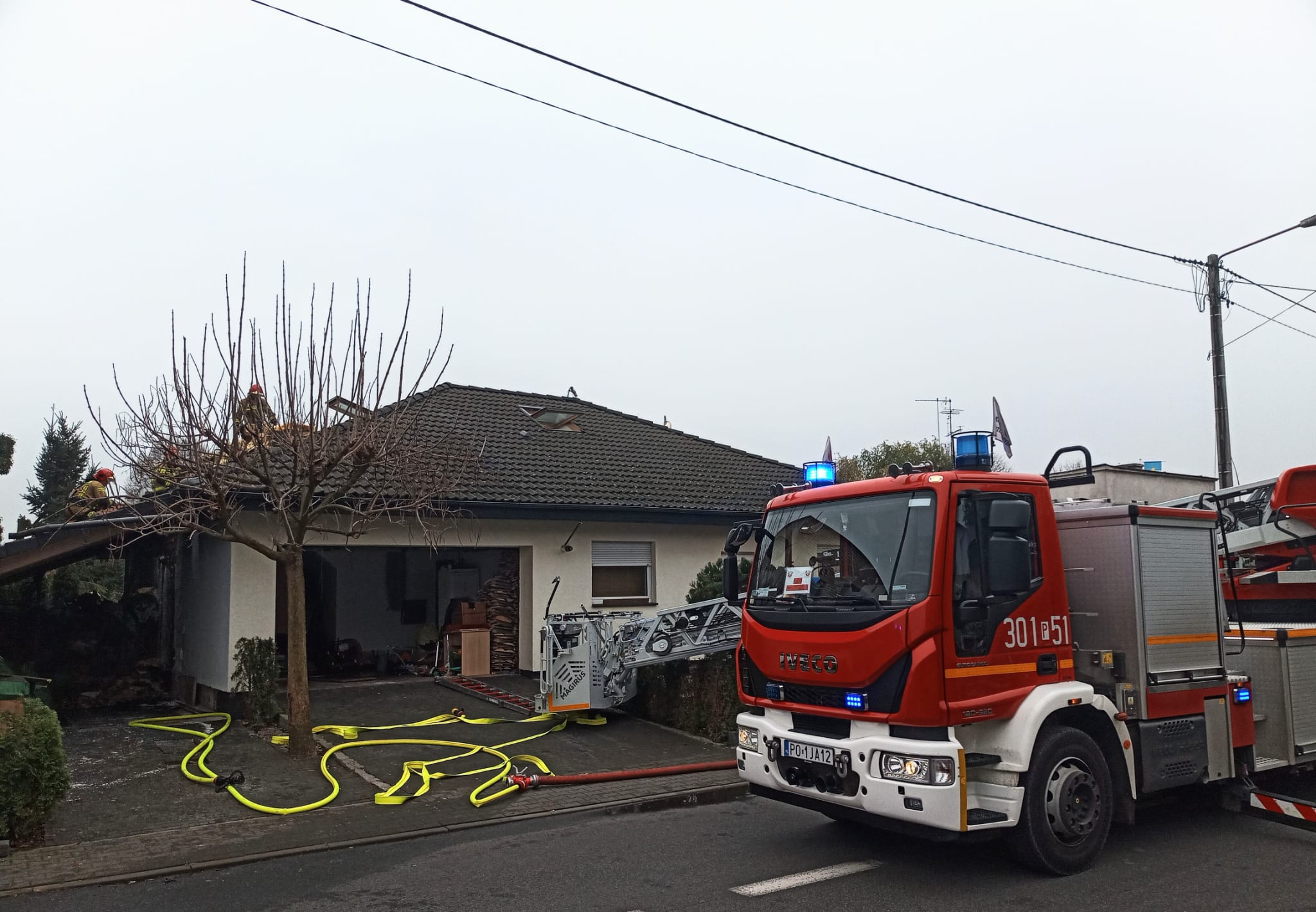 Po przybyciu na miejsce zdarzenia pierwszych jednostek ochrony przeciwpożarowej z JRG-3, JRG-1 i OSP Swarzędz okazało się, że pod wiatą samochodową przylegającą do budynku doszło do pożaru pojemnika na odpady. Niestety ogień zdążył się przedostać na elewację oraz w przestrzeń poddasza. Działania strażaków polegały na zabezpieczeniu miejsca zdarzenia, poprowadzeniu linii gaśniczej w natarciu, pracach rozbiórkowych połaci dachu, stałej obserwacji dachu przy wykorzystaniu drabiny mechanicznej oraz kamery termowizyjnej. Na koniec działań sprawdzono pomieszczenia detektorem wielogazowym, który nie wskazał zagrożenia.