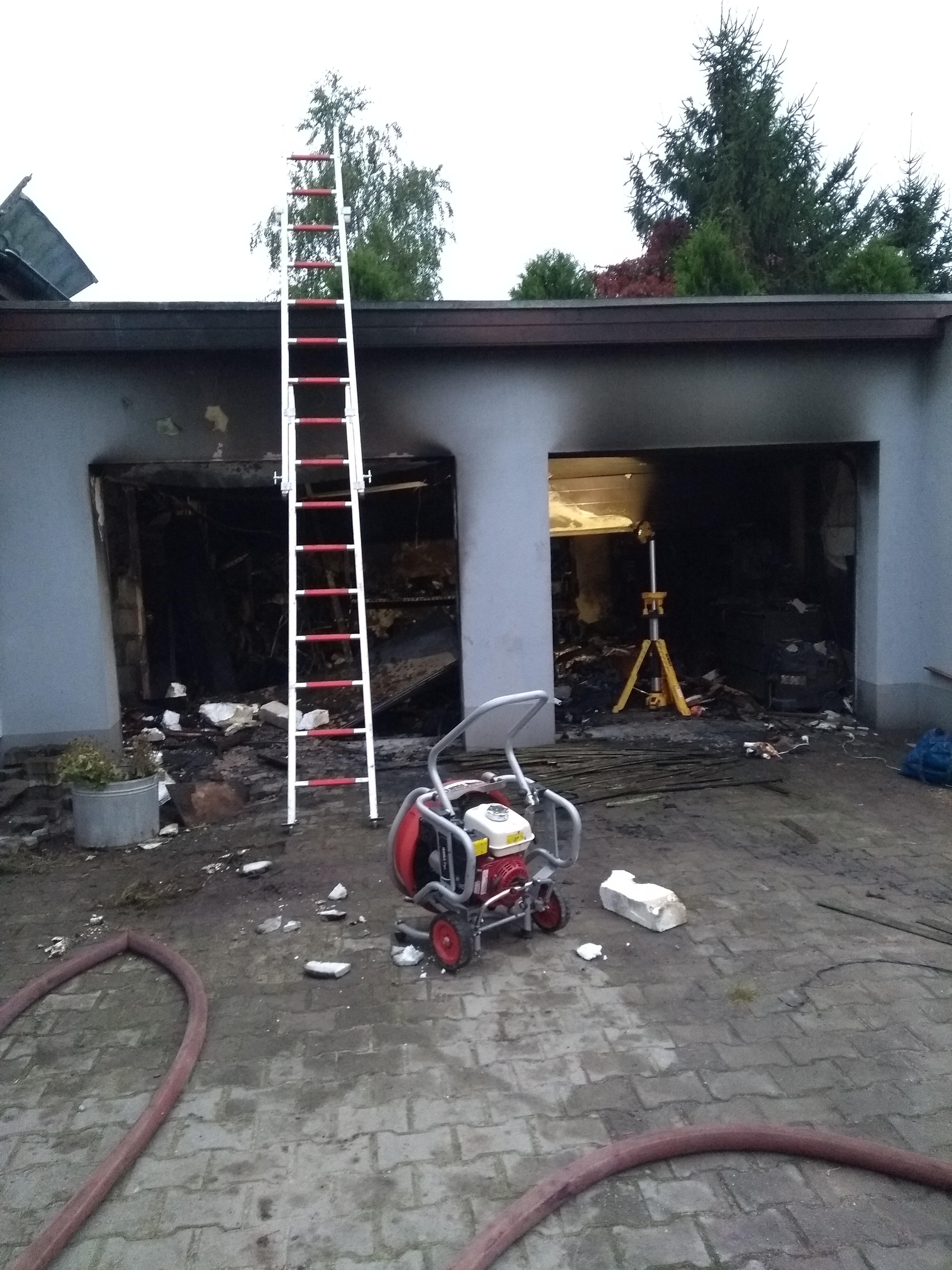 Zastęp z Jednostki Ratowniczo-Gaśniczej nr 9 został zadysponowany do pożaru garażu w Rogalinie. Po dojeździe na miejsce okazało się, że pożarem faktycznie objęta była część garażowa budynku, jednak istniało zagrożenie, że ogień może się rozprzestrzenić również na część mieszkalną. Strażacy działali zatem nie tylko w natarciu na pożar, lecz bronili również pozostałych pomieszczeń budynku. Sprawnie przeprowadzone działania pozwoliły dość szybko uporać się z ogniem, po czym zostało dogaszenie pogorzeliska i niezbędne prace rozbiórkowe. Część mieszkalna została uratowana, a budynek przewietrzony i sprawdzony kamerą termowizyjną oraz czujnikami gazowymi. Dzięki temu możliwe było stwierdzenie braku dalszego zagrożenia dla mieszkańców. W działaniach, oprócz JRG-9, brały również udział zastępy z OSP Mosina, OSP Radzewice oraz OSP Kórnik..
