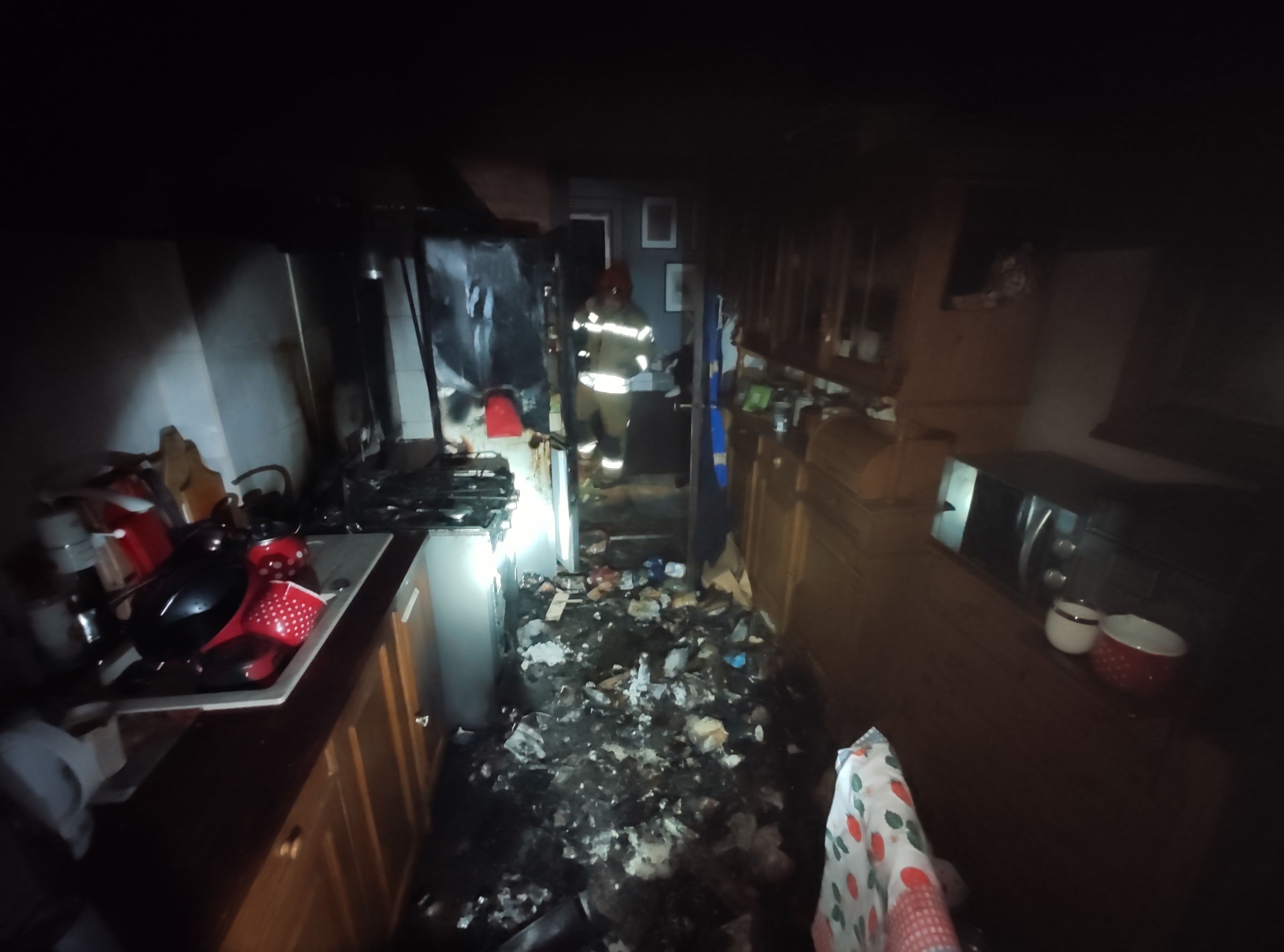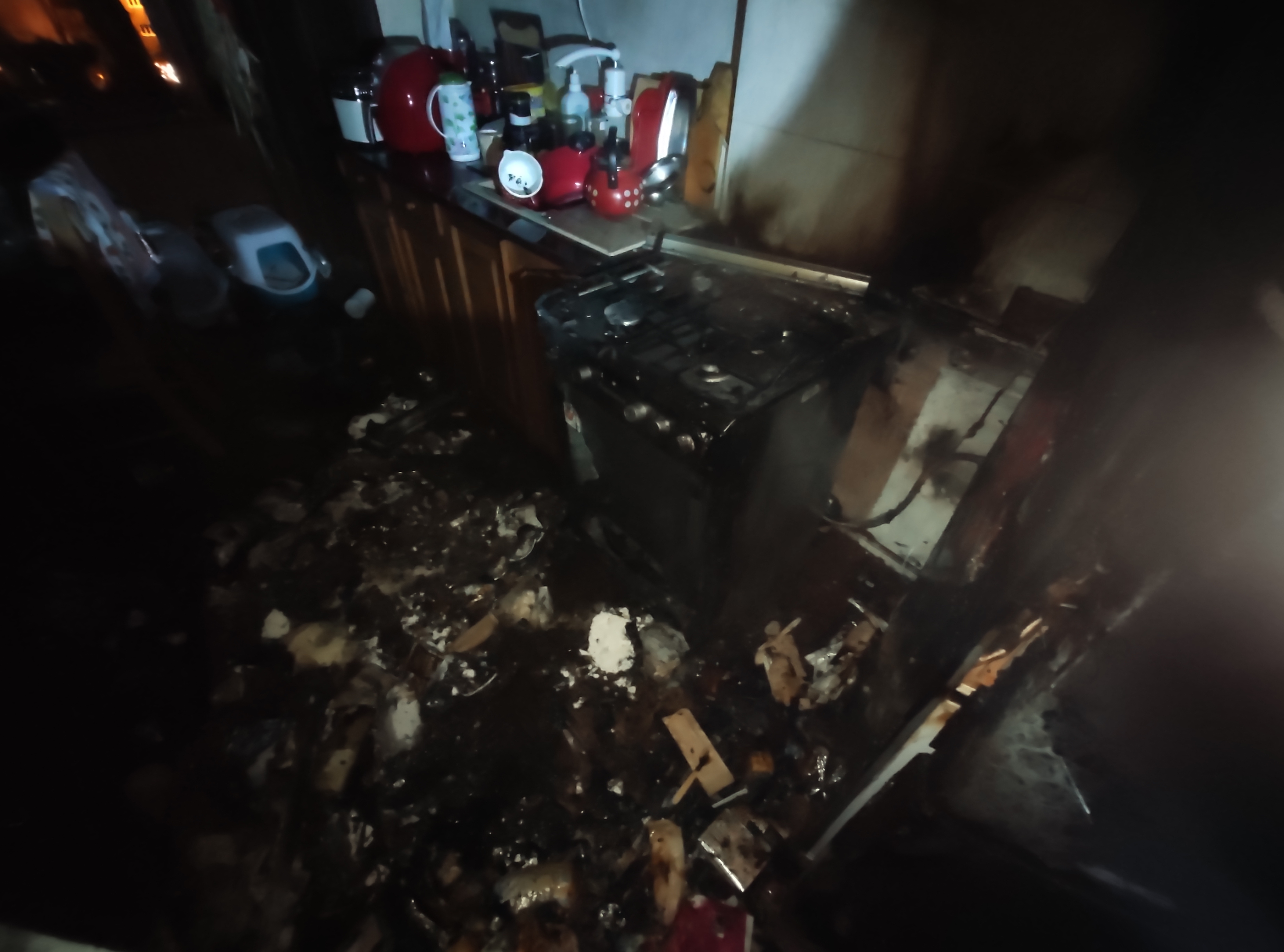 Po przybyciu na miejsce zdarzenia stwierdzono, że pali się w kuchni jednego z mieszkań na II piętrze. Przed przybyciem zastępów PSP lokatorka mieszkania ewakuowała się z mieszkania przy wsparciu sąsiadów, którzy również próbowali ugasić pożar, jednak bezskutecznie.