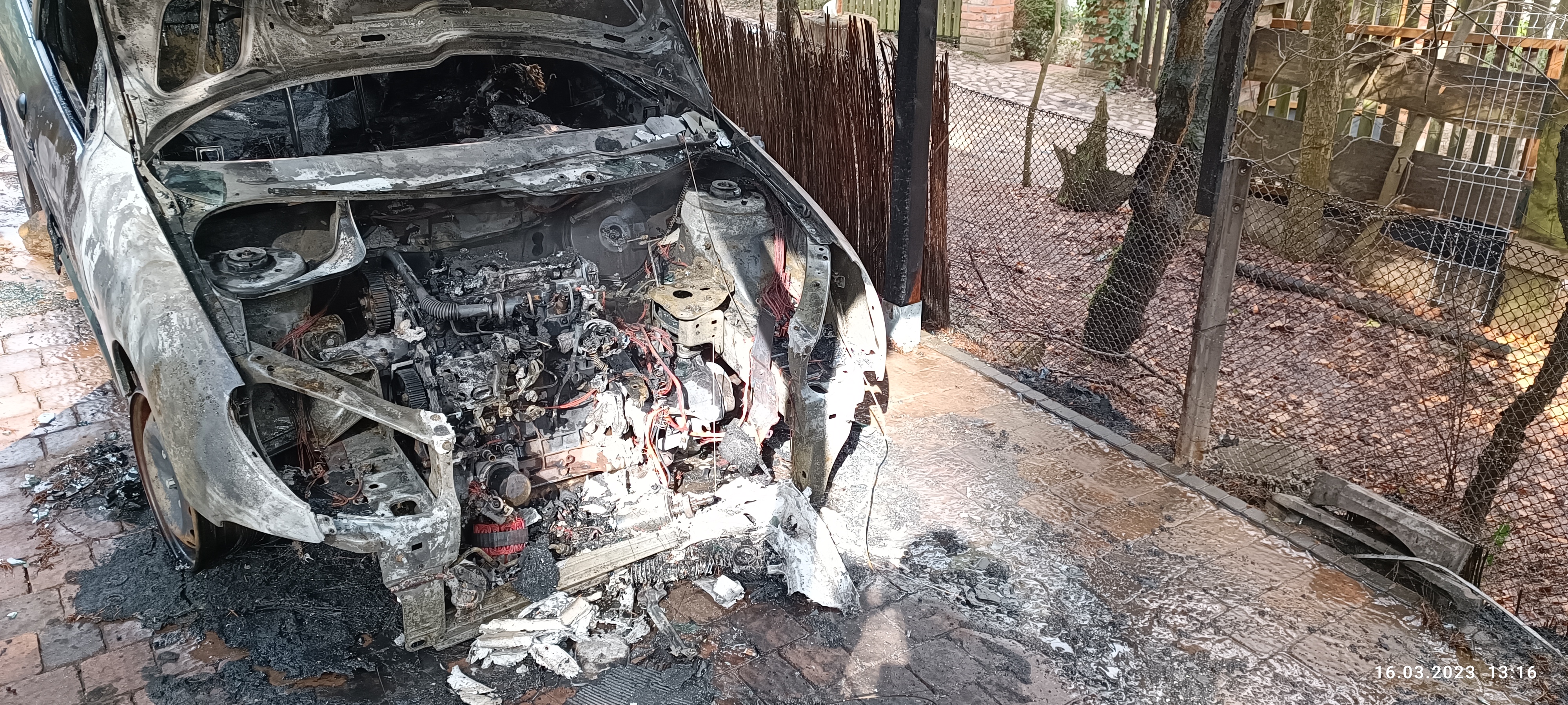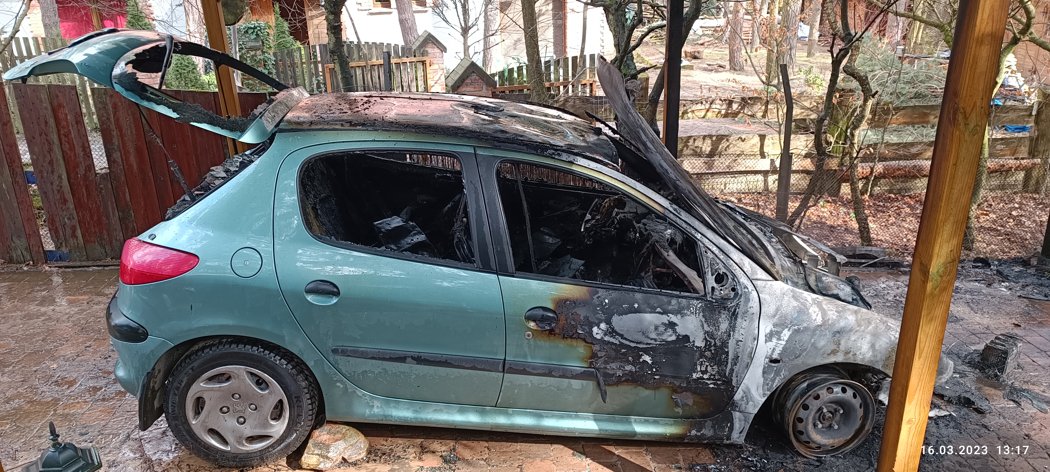 16 marca 2023 r. około godziny 12:20 zastępy GBA i GCBA z Jednostki Ratowniczo-Gaśniczej nr 8 w Bolechowie zostały zadysponowane do pożaru samochodu osobowego w miejscowości Potasze. Po przybyciu na miejsce zdarzenia zastano samochód osobowy marki Peugeot 206 w całości objęty pożarem oraz palącą się drewnianą wiatę garażową. Działania zastępów polegały na: zabezpieczeniu miejsca zdarzenia, podaniu dwóch prądów gaśniczych – jednego w natarciu na palące się obiekty, a drugiego w obronie. Lokalizacja pożaru pozwoliła na przeszukanie pogorzeliska, sprawdzenie za pomocą kamery termowizyjnej temperatur i dogaszenie oraz schłodzenie elementów samochodu i wiaty garażowej. Po zakończonych czynnościach i przekazaniu miejsca zdarzenia zastępy wróciły do jednostki.
