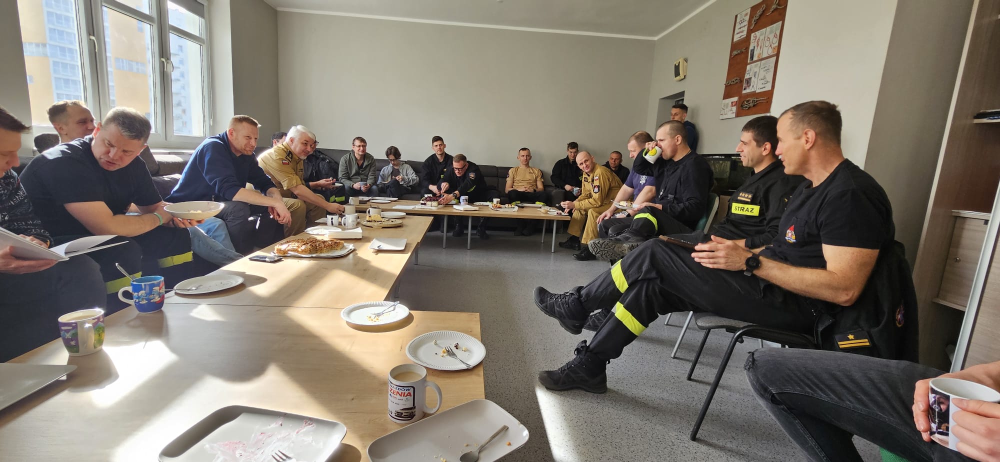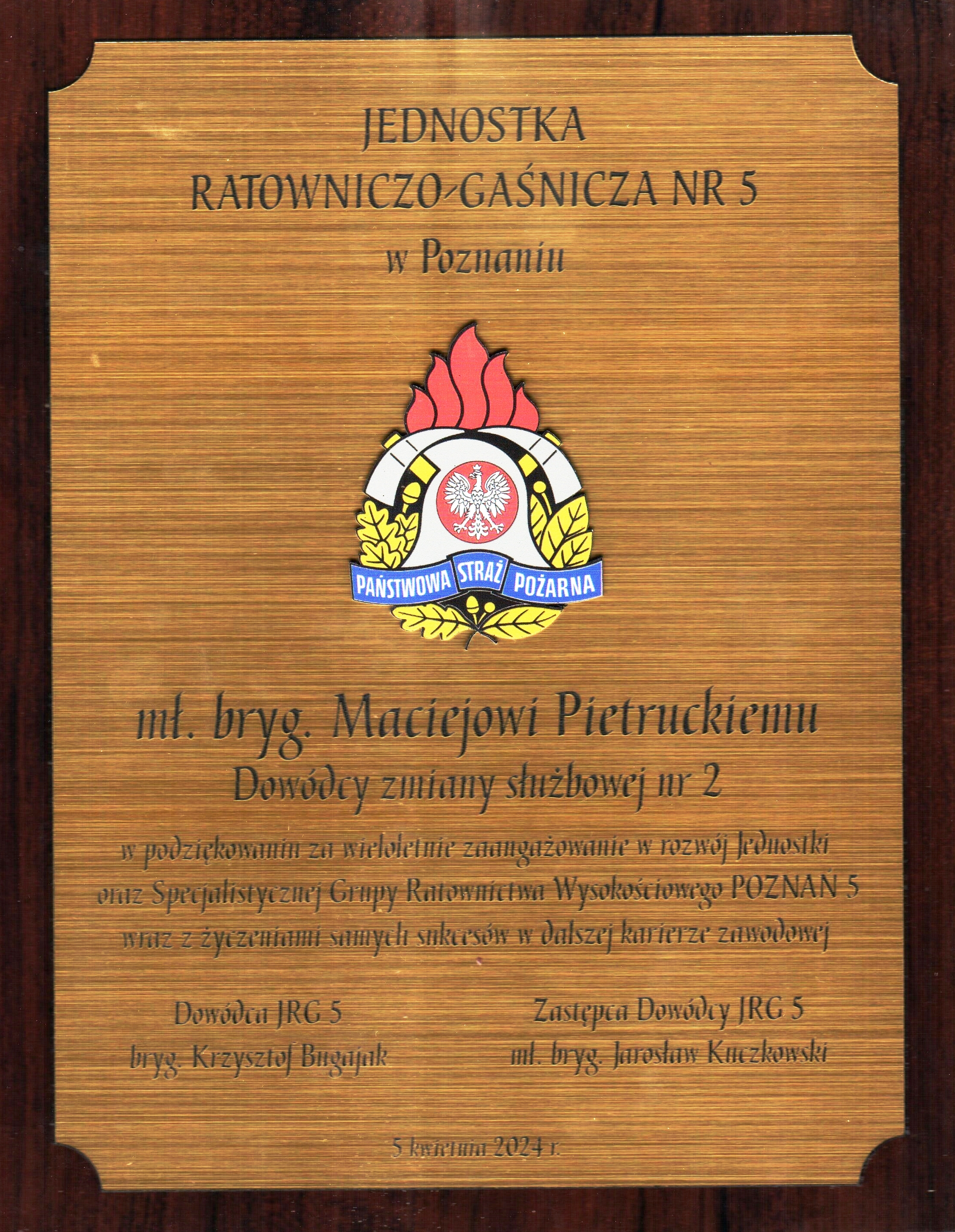 W ostatni dzień służby Dowódca JRG wraz z Zastępcą pożegnali Macieja wręczając mu pamiątkowy ryngraf. Były też życzenia samych sukcesów na dalszej ścieżce drogi zawodowej. Koledzy z pozostałych zmian również pożegnali Macieja wręczając mu okolicznościowe pamiątki, a także byli funkcjonariusze naszej jednostki przywitali w swoim gronie nowego kolegę. Po wszystkim nastąpiło jego (jak się okazało) pierwsze i ostatnie bicie w dzwon oraz pożegnalna kawa i słodkie.