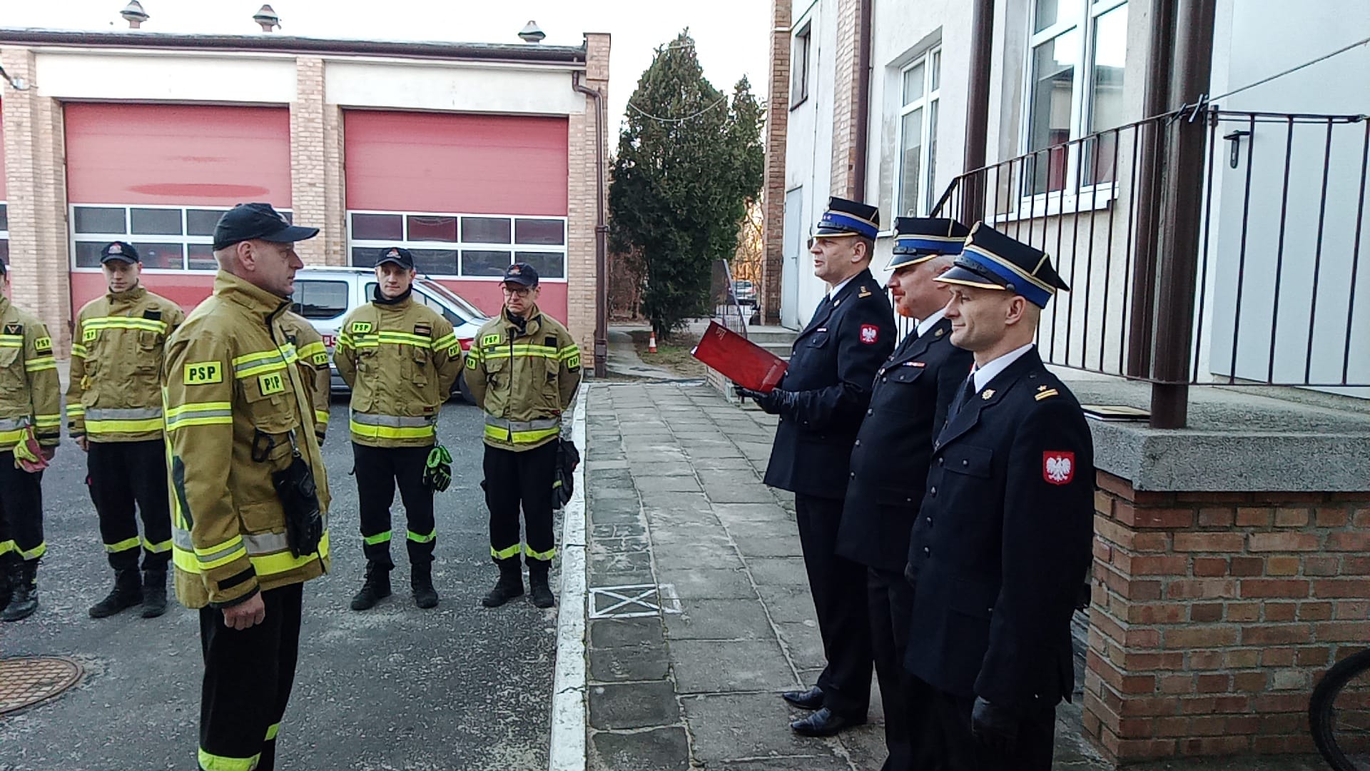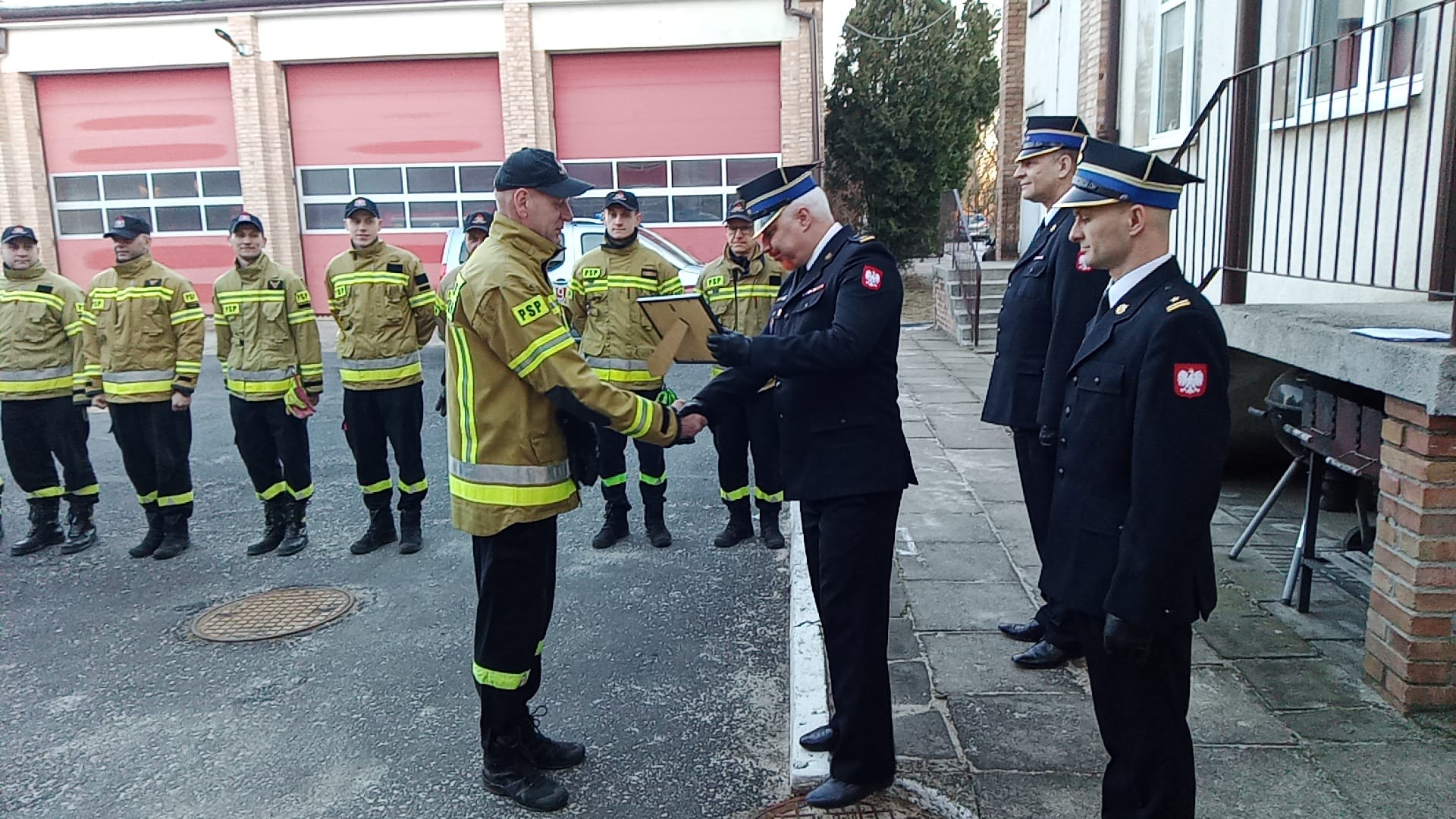 Zmianę służby zaszczycił Zastępca Komendanta Miejskiego Państwowej Straży Pożarnej w Poznaniu st. bryg. Damian Jankowiak, który pokrótce przedstawił przebieg kariery zawodowej Marcina, a także odczytał list gratulacyjny od Komendanta Miejskiego PSP st. bryg. Jacka Michalaka skierowany do przyszłego emeryta. Następnie głos zabrał Dowódca Jednostki Ratowniczo-Gaśniczej w krótkich żołnierskich słowach relacjonując służbę Marcina i wręczając mu pamiątkowe monidło. Zastępca Dowódcy również podziękował Marcinowi za służbę i nadszedł czas na ostatnie bicie w dzwon, prezenty od kolegów z jednostki oraz emerytów, pamiątkowe zdjęcie oraz logowanie na ścianie. Potem już tylko czas na wspomnienia ze służby przy kawie przerwany wyjazdem do wypadku. Taka to ostatnia służba jak zwykle średnio spokojna.