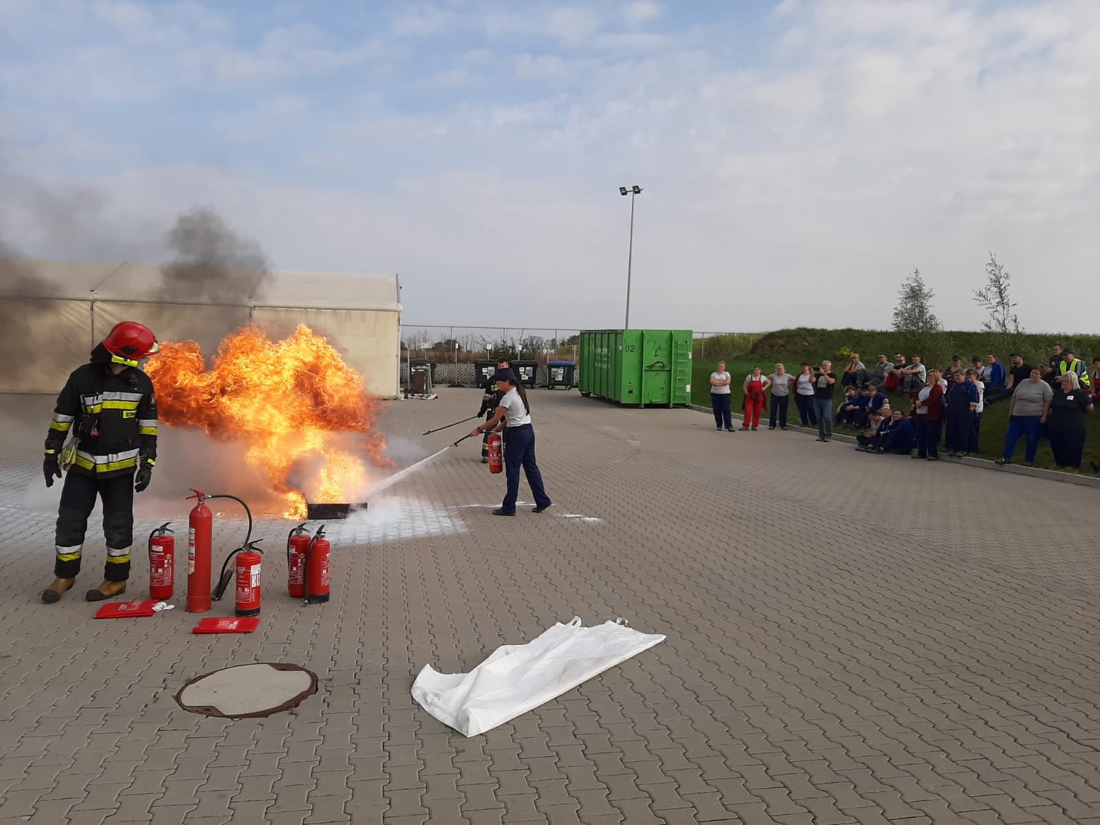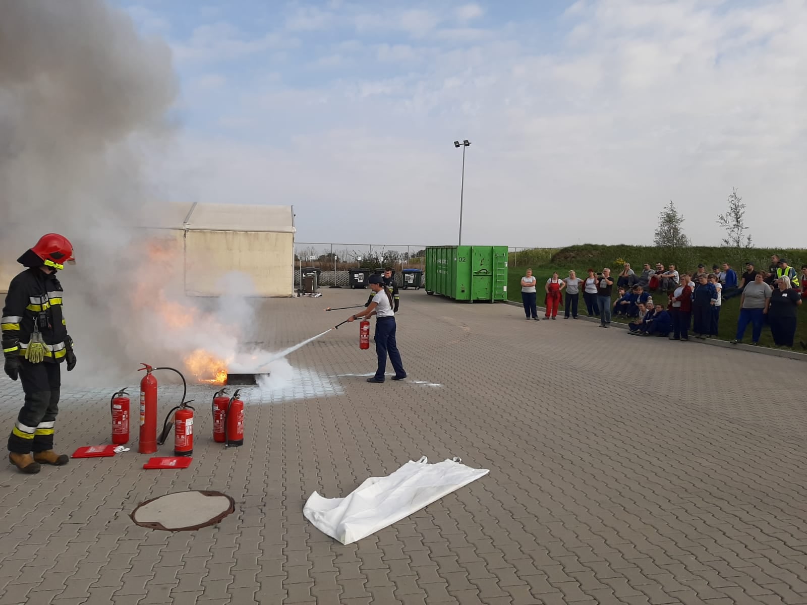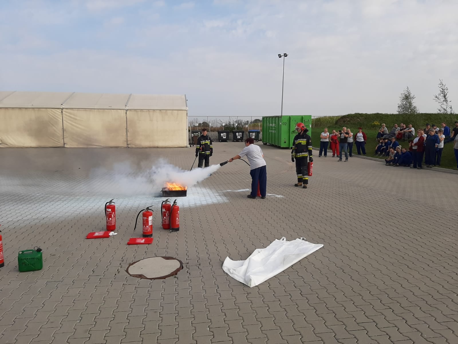 Następnie pracownicy firmy wraz ze strażakami udali się na plac zakładu w celu doskonalenia obsługi podręcznego sprzętu gaśniczego. Na przygotowanej przez strażaków JRG 4 pozoracji pożaru pracownicy mogli przećwiczyć obsługę gaśnic znajdujących się na wyposażeniu budynku.