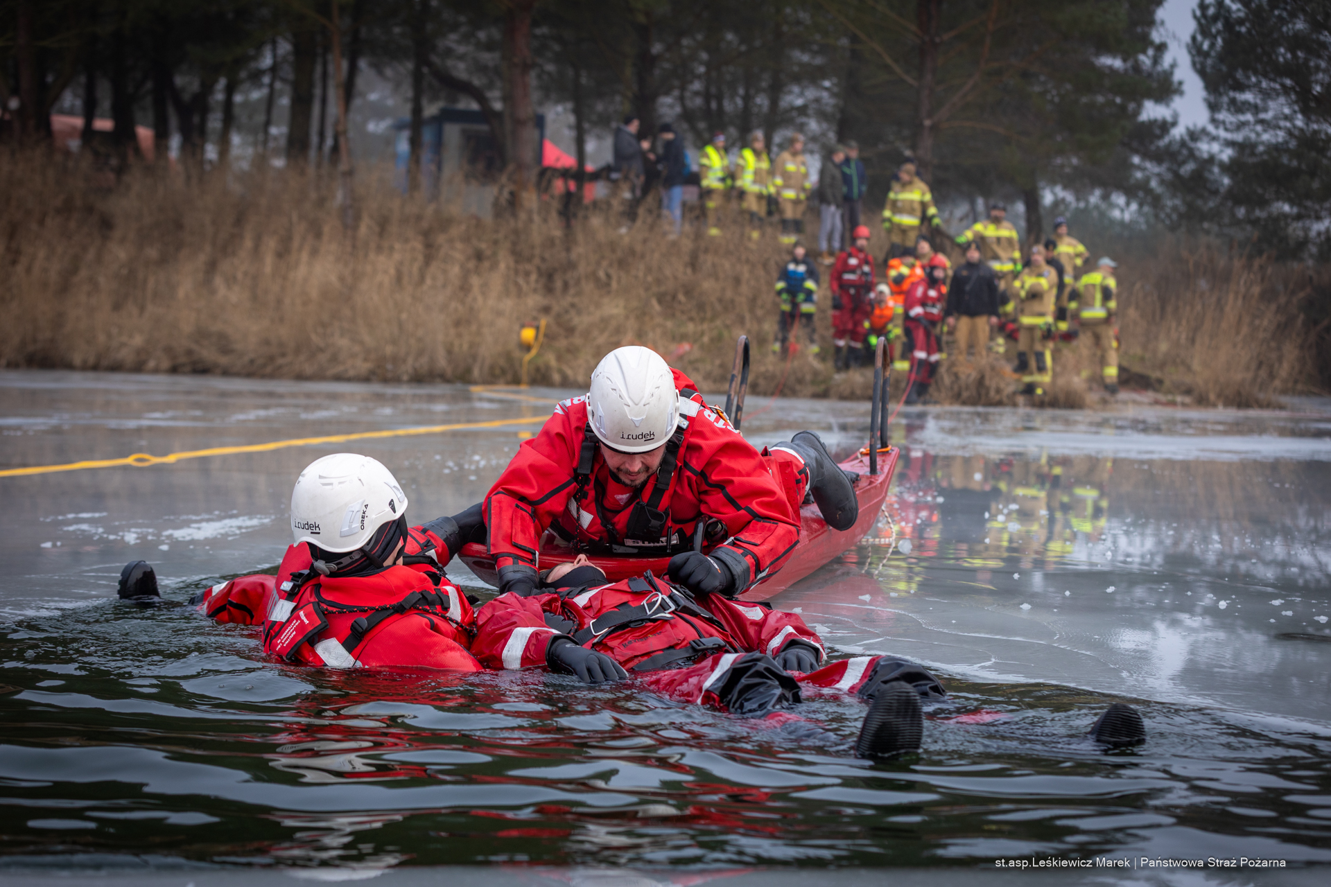 Istotnym elementem szkolenia były również działania medyczne podejmowane po wyciągnięciu poszkodowanego na brzeg. Szczególną uwagę poświęcono zagadnieniu hipotermii, jej rozpoznawaniu oraz zasadom udzielania pierwszej pomocy osobom wychłodzonym. Uczestnicy ćwiczeń omawiali i praktykowali właściwe postępowanie, które ma kluczowe znaczenie dla dalszego rokowania osoby uratowanej.